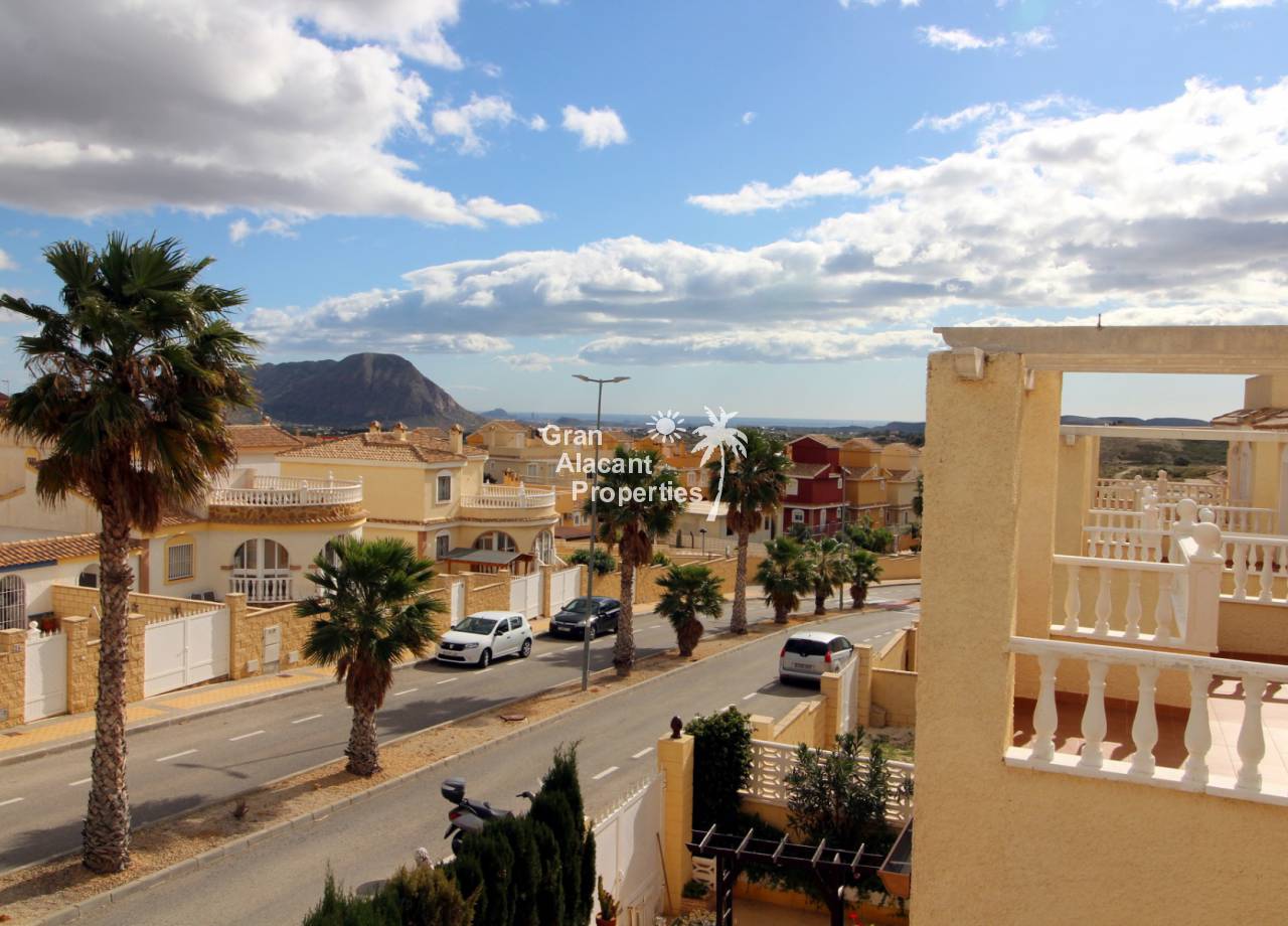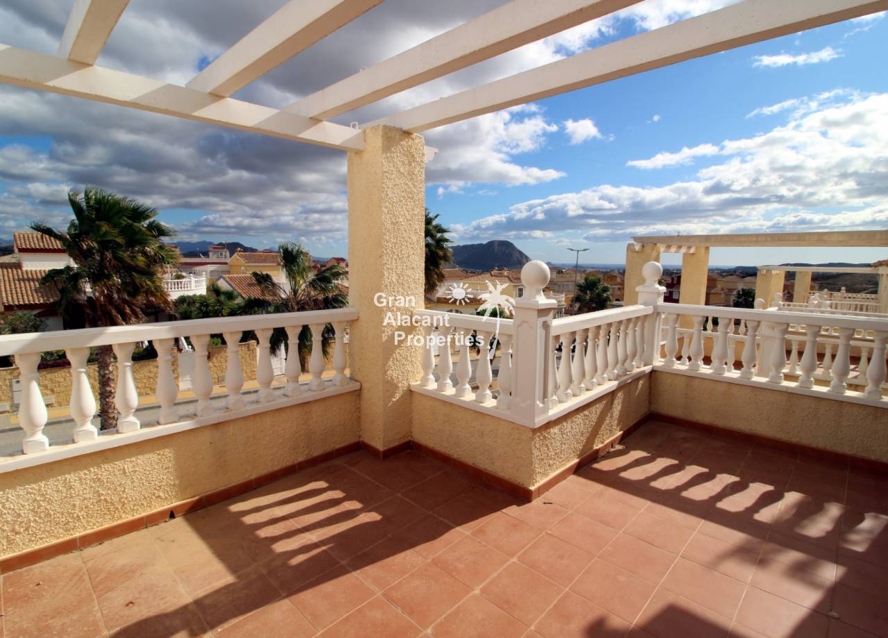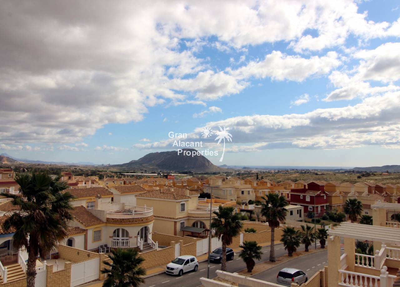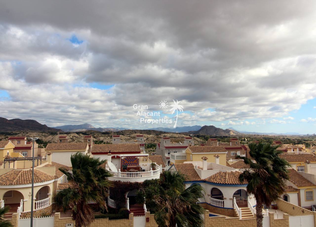 This detached 228 m² “Estrella” style villa is located on a 250 m² plot (approx) with commanding views over mountains, countryside and sea towards Alicante city from the solarium and balcony. Sitting in its own low maintenance gardens, this villa offers plenty of outside space for those barbecues and entertaining or just relaxing in the sun. To cool off there is your very own private swimming pool open 24 hours a day every day.