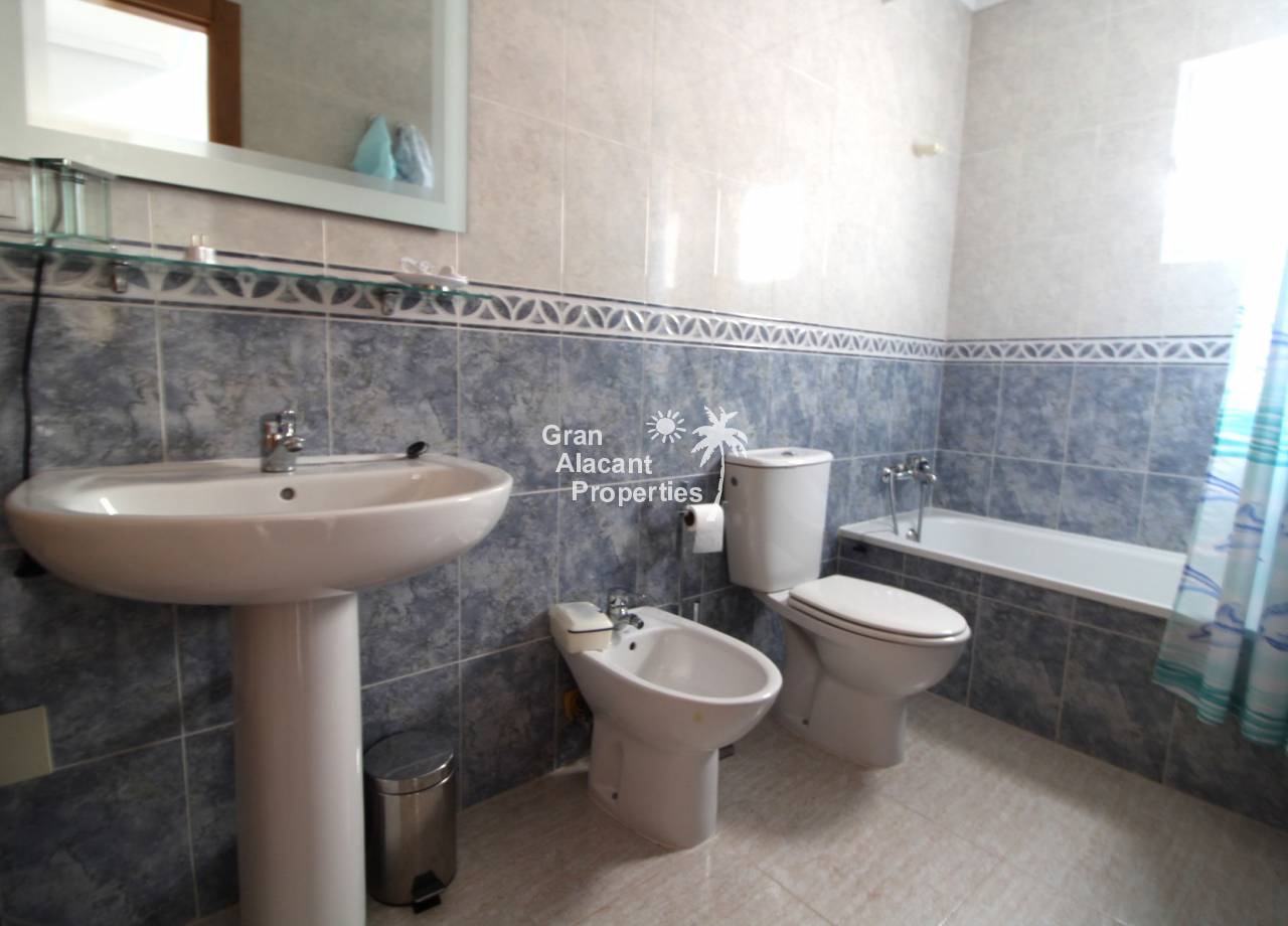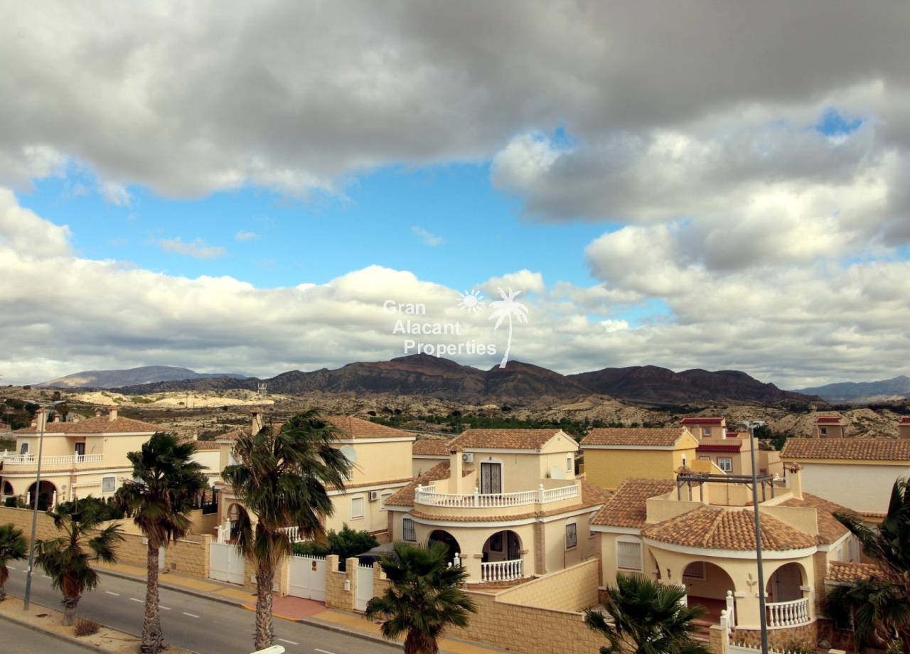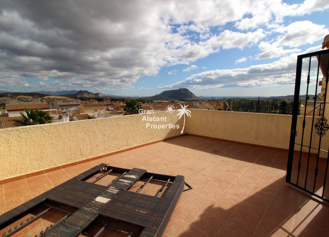 This detached 228 m² “Estrella” style villa is located on a 250 m² plot (approx) with commanding views over mountains, countryside and sea towards Alicante city from the solarium and balcony. Sitting in its own low maintenance gardens, this villa offers plenty of outside space for those barbecues and entertaining or just relaxing in the sun. To cool off there is your very own private swimming pool open 24 hours a day every day.
