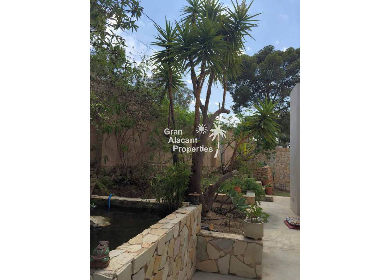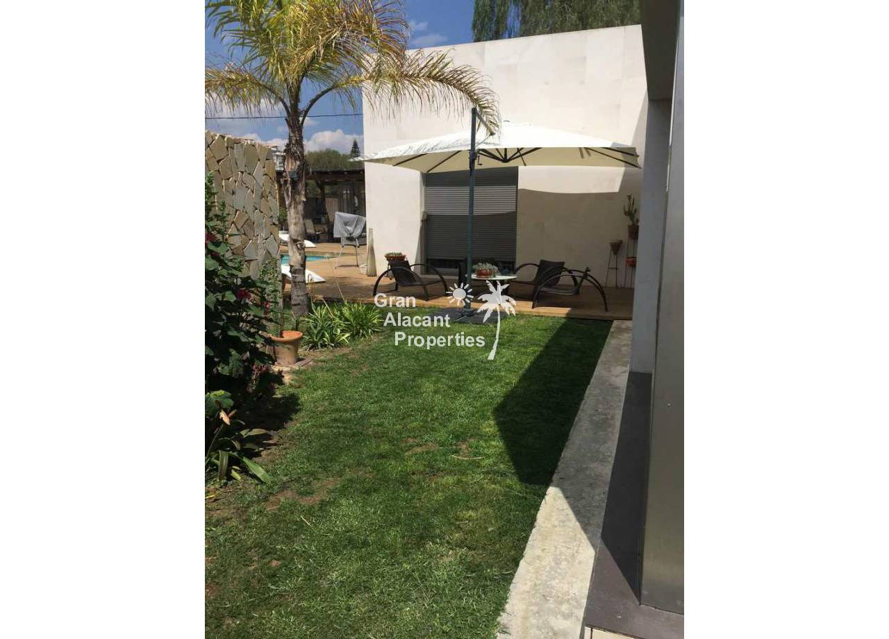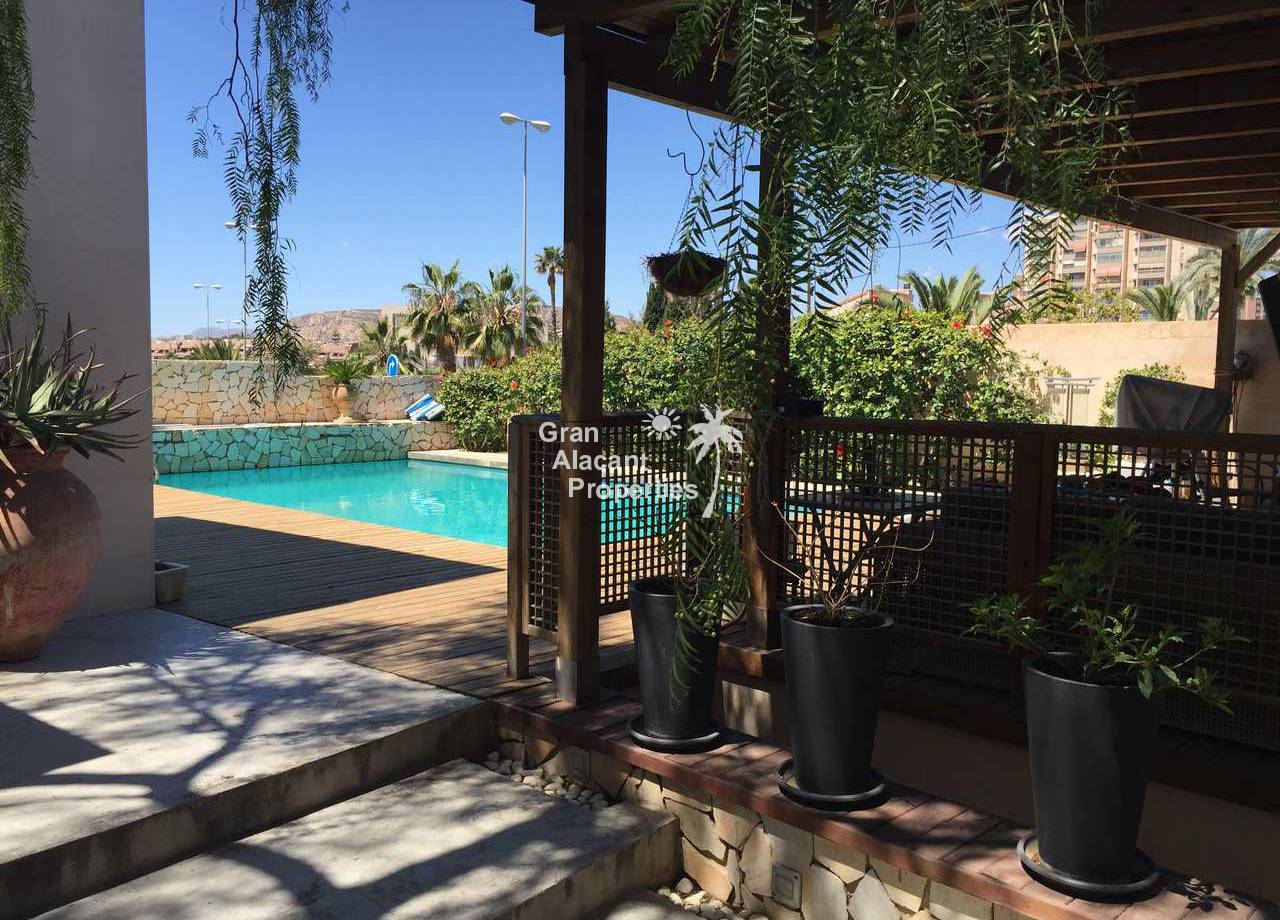 Sitting on a large urban plot of 850 m2, the low maintenance garden is landscaped with a variety of mature trees and plants including citrus and bougainvillia. High walls provide plenty of privacy. There is a lovely modern pool surrounded by a wooden deck with a garden shower. The garden features a pond, lawn, tiled patios plus a barbecue area for entertaining friends and family. A beautiful modern pergola acts an outdoor living room offering a sheltered spot to sit with a book or enjoy la hora del vermut. There are wonderful views of the mountains and green areas as well as the city of Alicante including Alicante Bay, the Med and Santa Barbara Castle. There is a garage and there is parking on the plot for several cars and automatic drive gates for access.