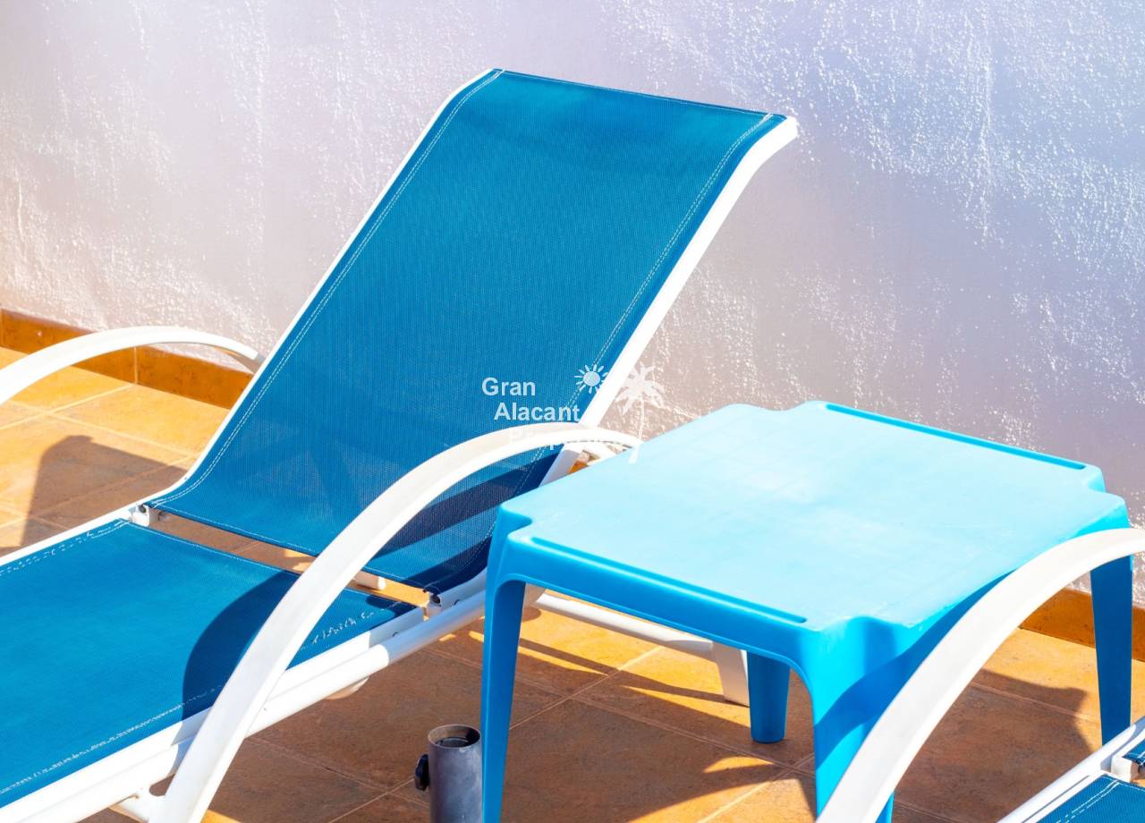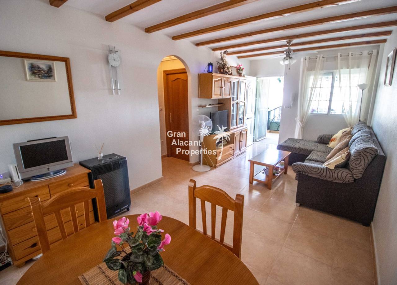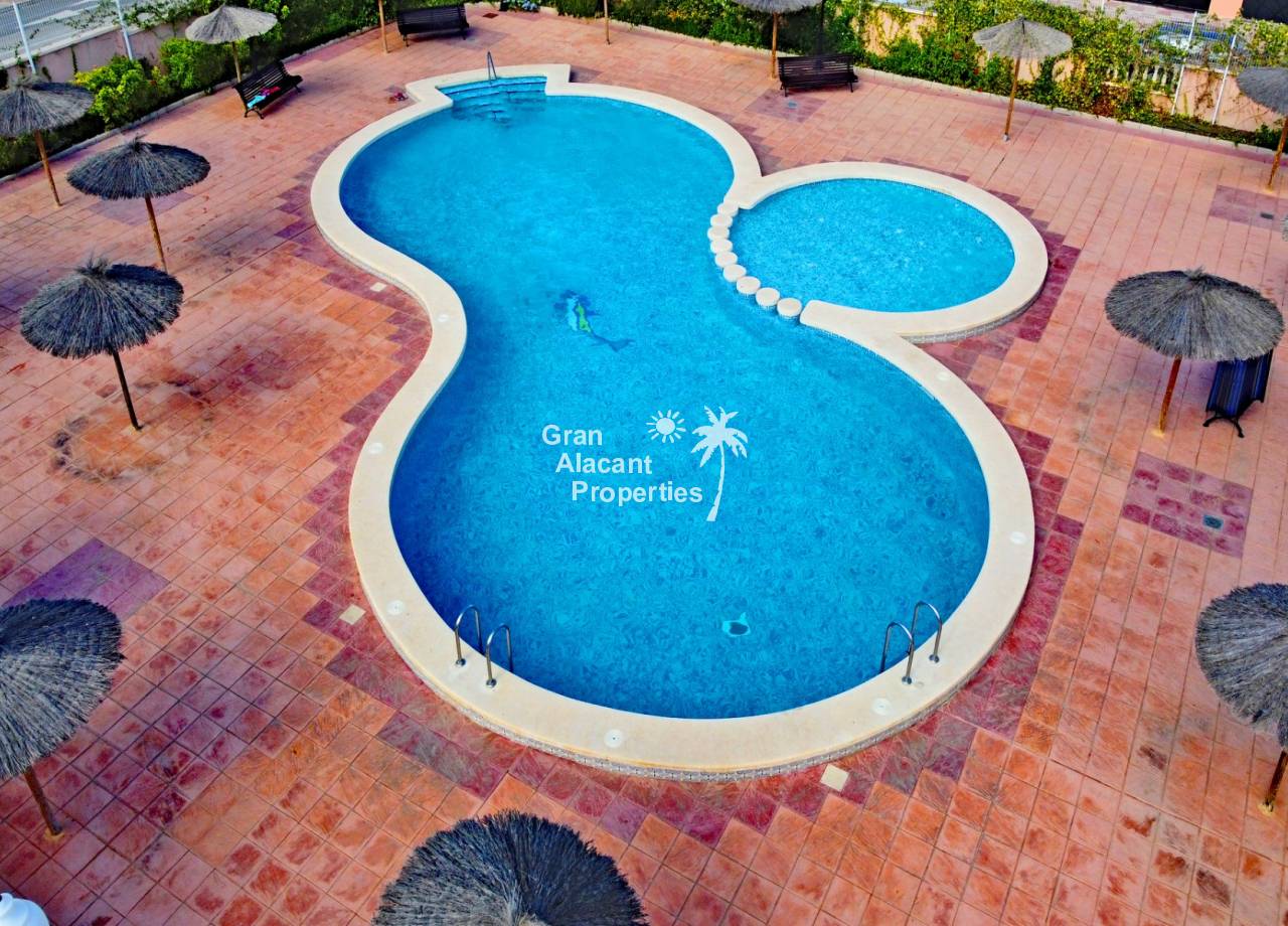 For sale south west facing first floor apartment in the popular Gran Alacant community Puerto Marino. This apartment features a large air-conditioned combined living and dining space with wood beamed ceiling, an open plan kitchen with granite worktop, 2 double bedrooms and a family bathroom. Outside there is a good sized balcony and an enormous rooftop solarium offering 360 views and sunshine all day. The apartment has security bars, window screens, double glazing, sun shades an allocated covered parking space and comes fully furnished and equipped.