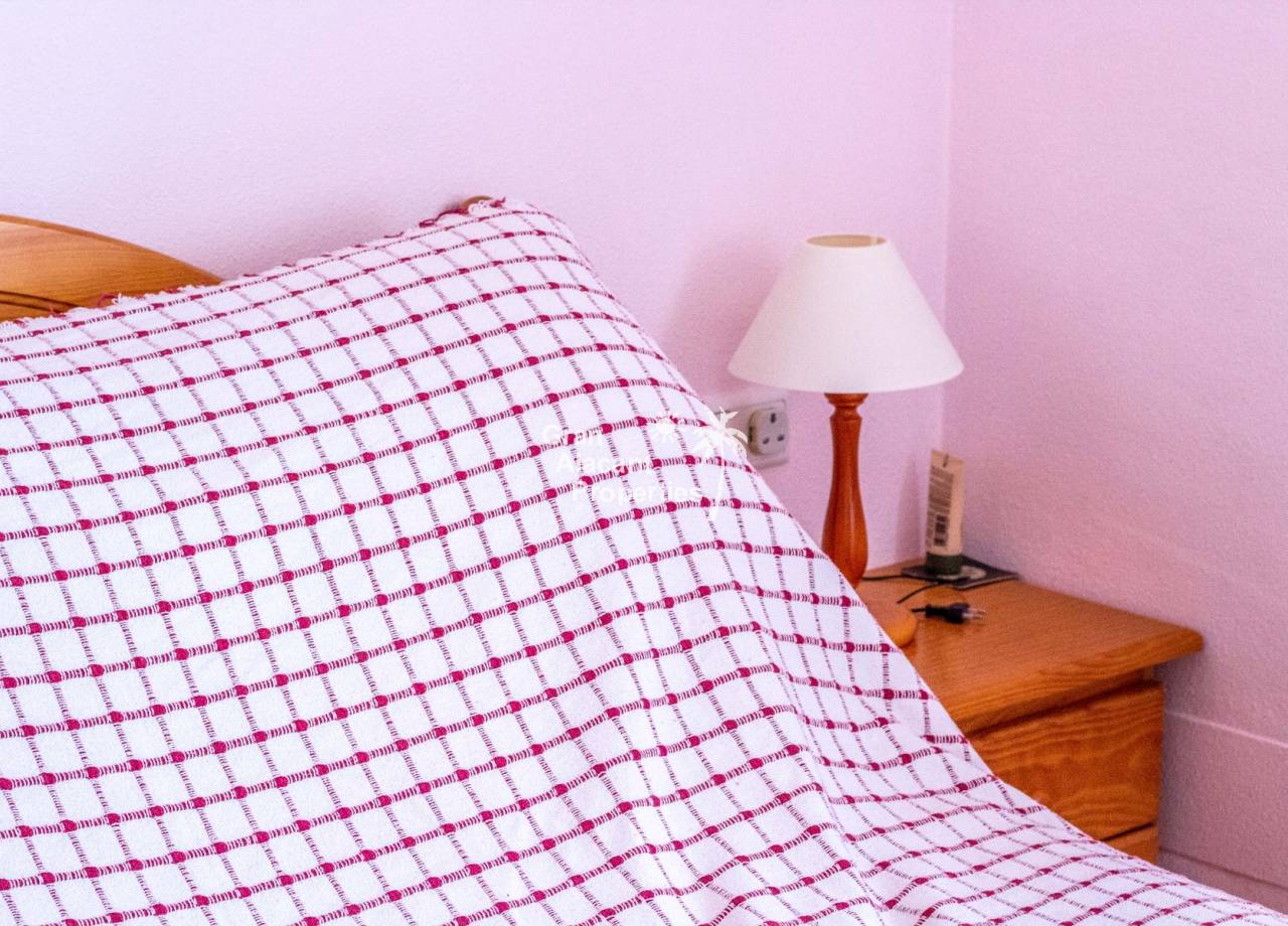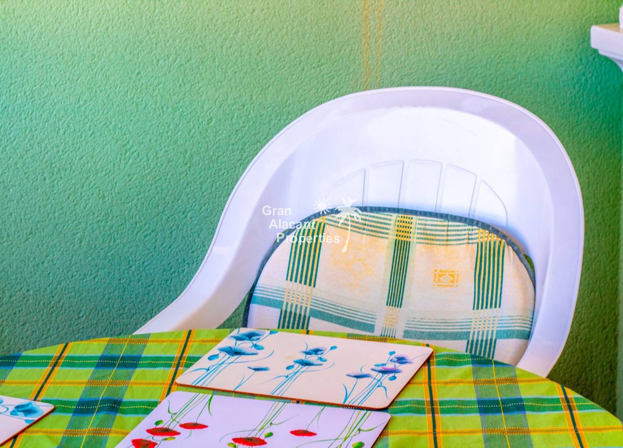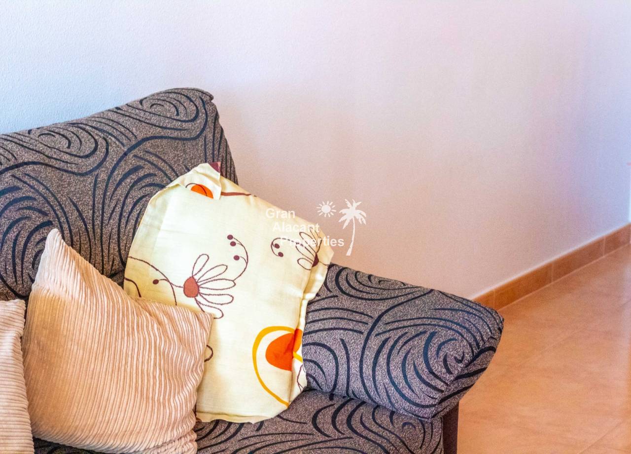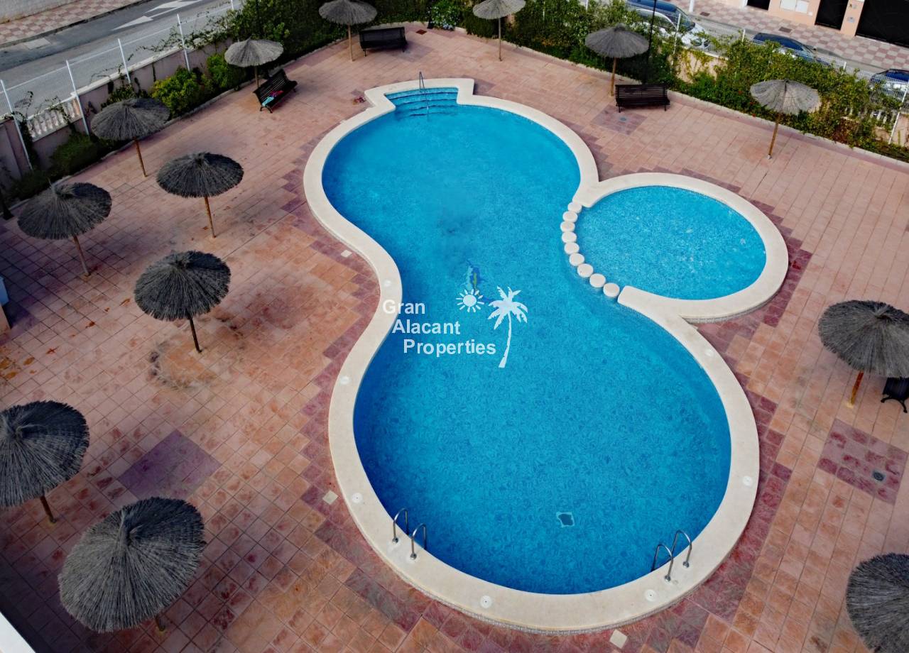 For sale south west facing first floor apartment in the popular Gran Alacant community Puerto Marino. This apartment features a large air-conditioned combined living and dining space with wood beamed ceiling, an open plan kitchen with granite worktop, 2 double bedrooms and a family bathroom. Outside there is a good sized balcony and an enormous rooftop solarium offering 360 views and sunshine all day. The apartment has security bars, window screens, double glazing, sun shades an allocated covered parking space and comes fully furnished and equipped.