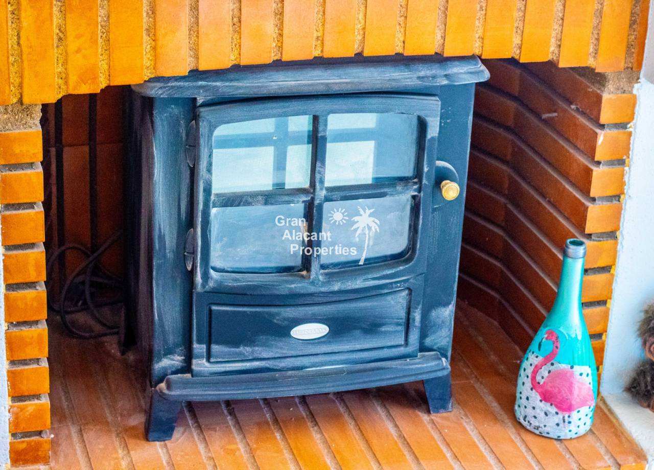 On the ground floor, step inside via the private front terrace and glazed 18 m² covered porch. A bright open-plan living room with air conditioning and fireplace creates a warm welcome. There is also a convenient guest bathroom and a large independent dine-in kitchen. Recently updated, the kitchen boasts modern navy cabinetry, a stylish backsplash with hidráulico-style accent tiles, a tower oven and microwave, new extractor, cooktop, and sink. Off the kitchen is a beautiful utility room finished with traditional celosía de cerámica and fitted with screens—allowing fresh air in with no insects. From here, step out to the rear terrace and small private garden (approx 8 m²) with direct access to the community spaces.