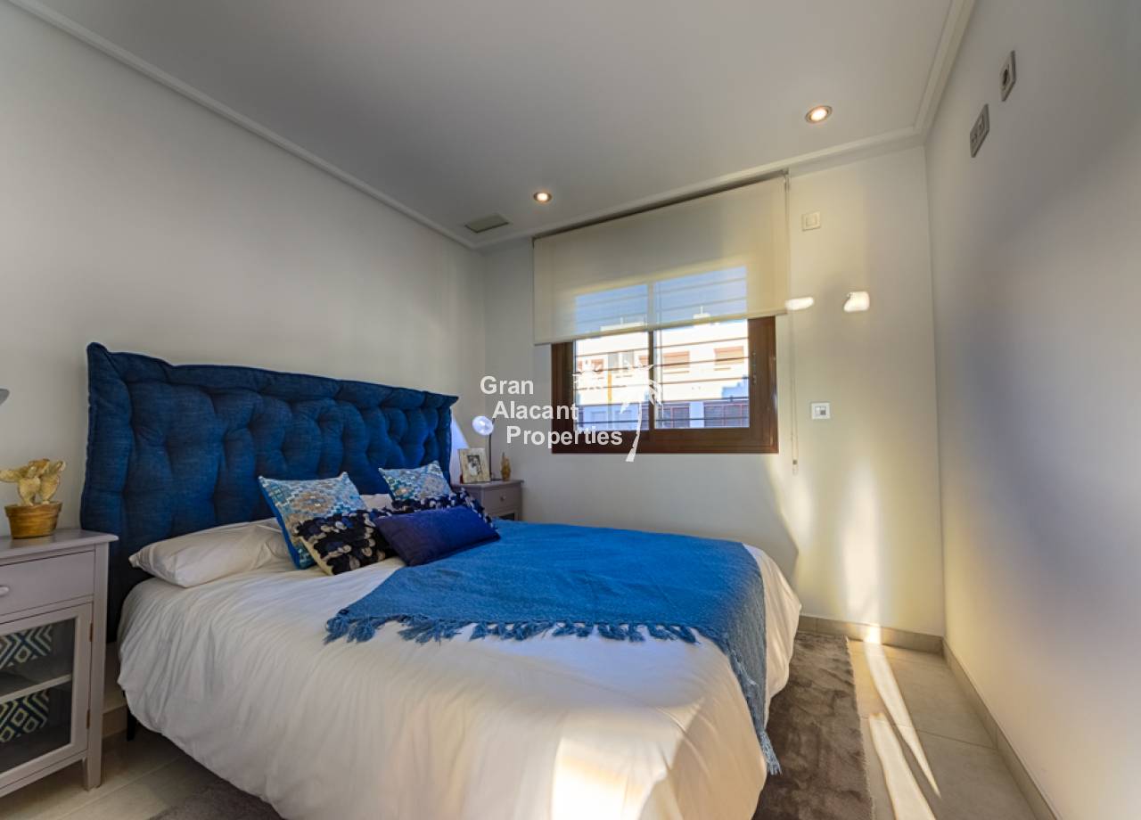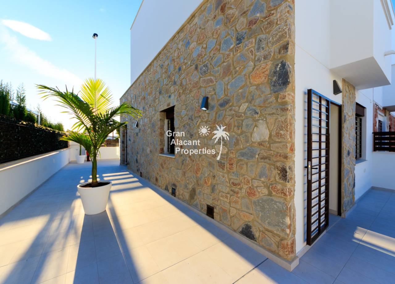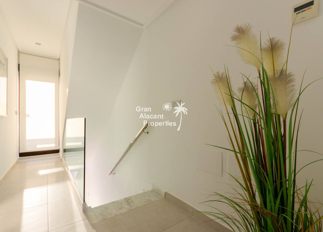 It is a new modern development of townhouses with lots of light and character. The area consists of a total of 14 townhouses of around 95m2 that are built in a quiet area in the south of Pilar de la Horadada with proximity to all that this lively Spanish town has to offer. In all the townhouses, the entrance is next to the front terrace. The houses have a consistent floor plan so that through the open kitchen on the ground floor you reach the terrace at the back and thus have direct access to the cosy pool area. On the ground floor you will also find a bedroom, a bathroom and a living room. The stairs lead you upstairs, where you will find two more bedrooms, a bathroom and a balcony with an external staircase to the large roof terrace of almost 40 m².