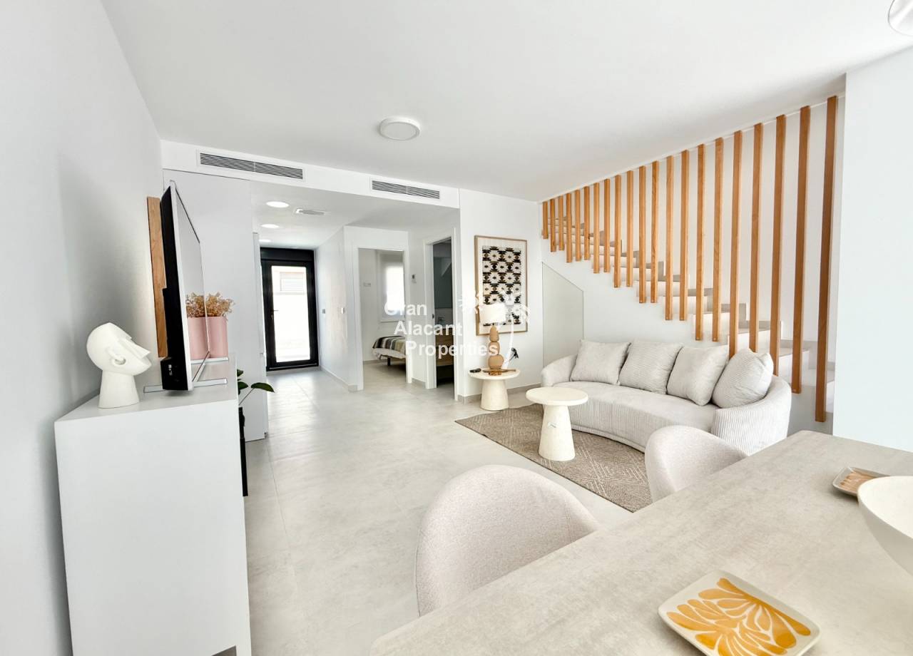 The interior of the townhouses is designed to offer comfort and modernity. With three bedrooms and two bathrooms, each home is equipped to meet the needs of families or couples seeking space and functionality. The porcelain tile floors add a touch of elegance and are easy to maintain. Electric shutters and included appliances make daily life easier, while built-in wardrobes offer practical storage solutions. The pre-installation of air conditioning ensures the home is ready to maintain a pleasant temperature year-round.