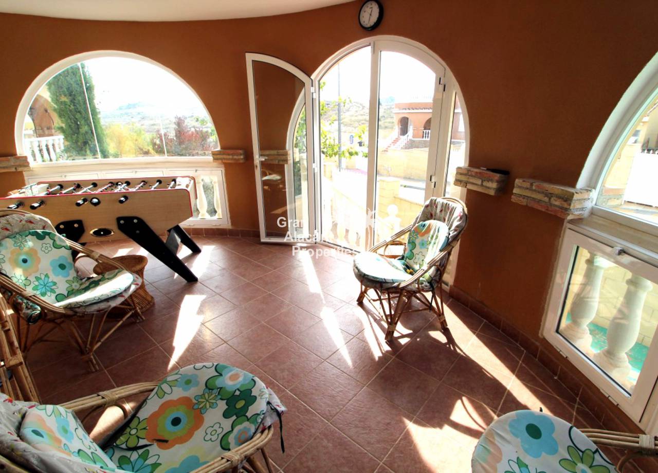 The property offers a glazed in porch, 3 bedrooms (2 of which are en-suite) and 3 bathrooms, a large open plan living and dining room , a galley style kitchen with direct access to outside and an internal staircase down to the basement level. There is a large solarium offering good mountain and then a covered terrace and 320m² of gardens with your own private heated swimming pool and the orientation of the house means lots of sunshine. There is an  under build currently being used as a garage, workshop (with WC) plus guest accommodation considting of 2 bedrooms, a living space with kitchenette and a shower room. There is partial air-conditioning (both hot & cold), ceiling fans, pool safety fence, garden pergola and much, much more.