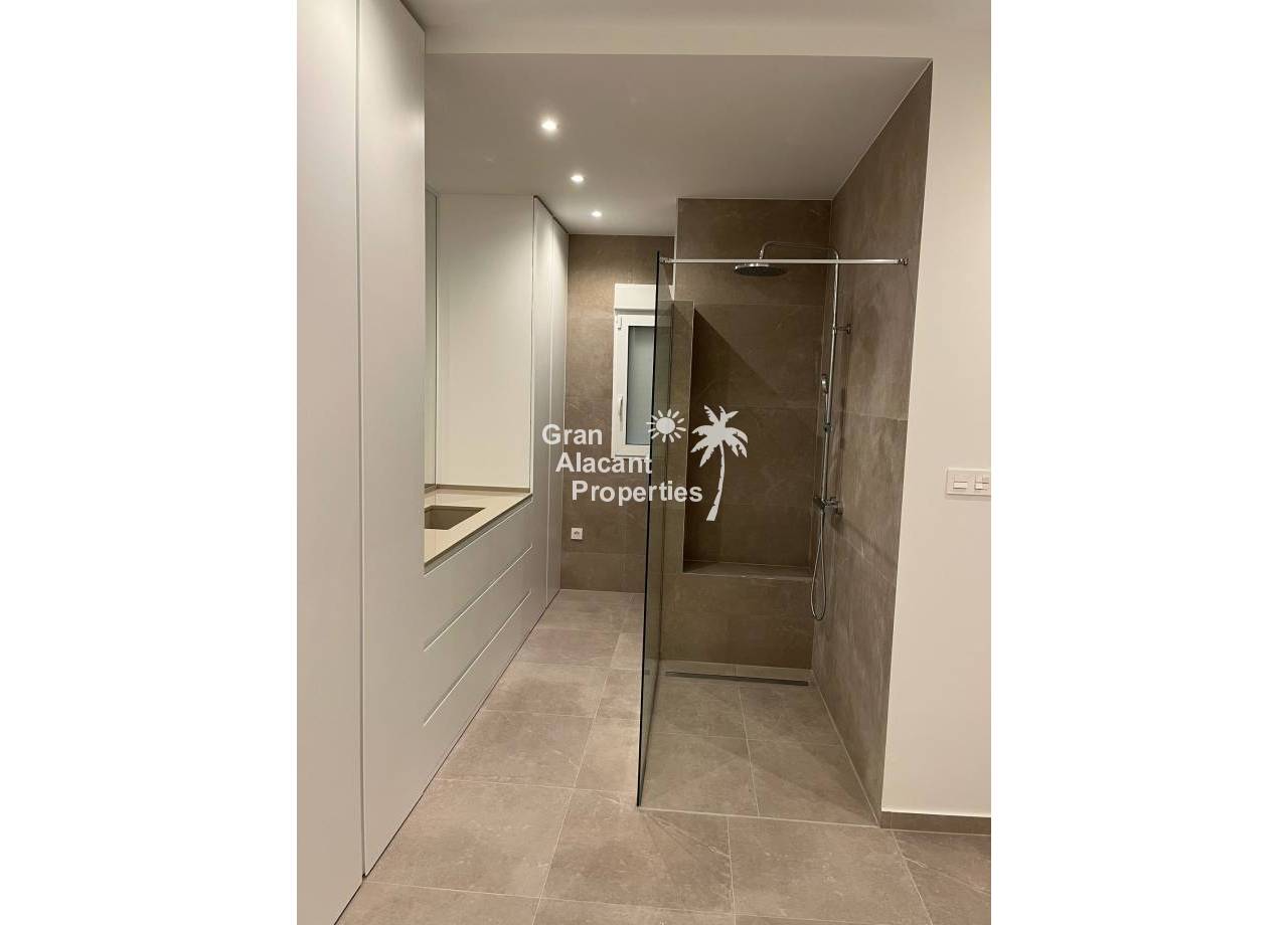 The interior of the villa is carefully designed to offer comfort and style. It features three bedrooms, making it perfect for families or those needing extra space for guests or an office. The two bathrooms are equipped with modern finishes. The porcelain tile flooring adds an elegant touch and is easy to maintain. Electric shutters and air conditioning ensure a comfortable environment year-round. The kitchen is equipped with modern appliances, facilitating daily tasks. Built-in wardrobes in the bedrooms offer ample storage space, maintaining order and organization.