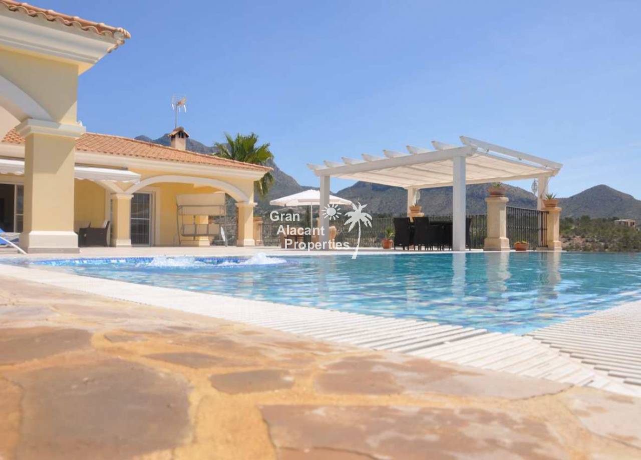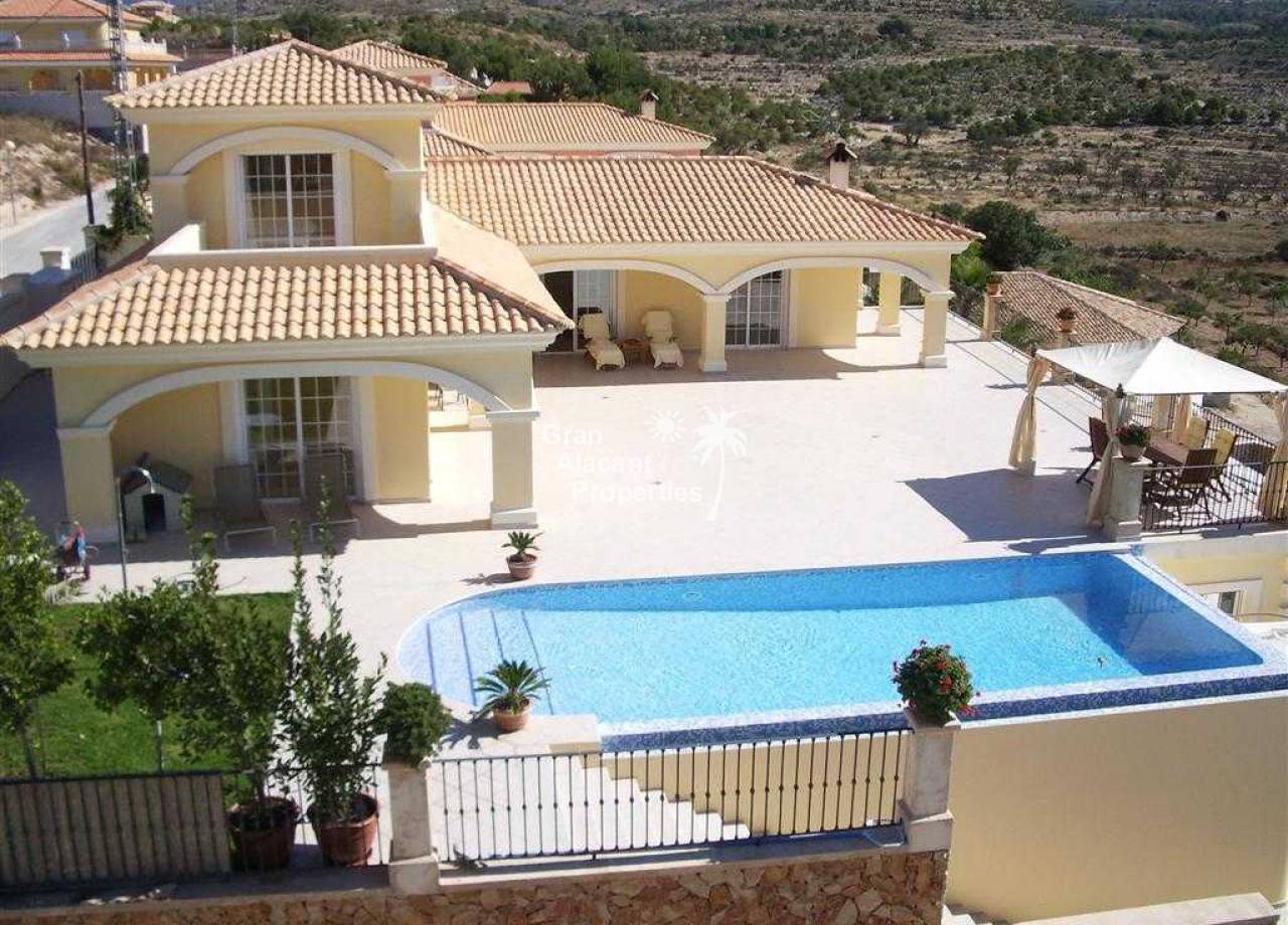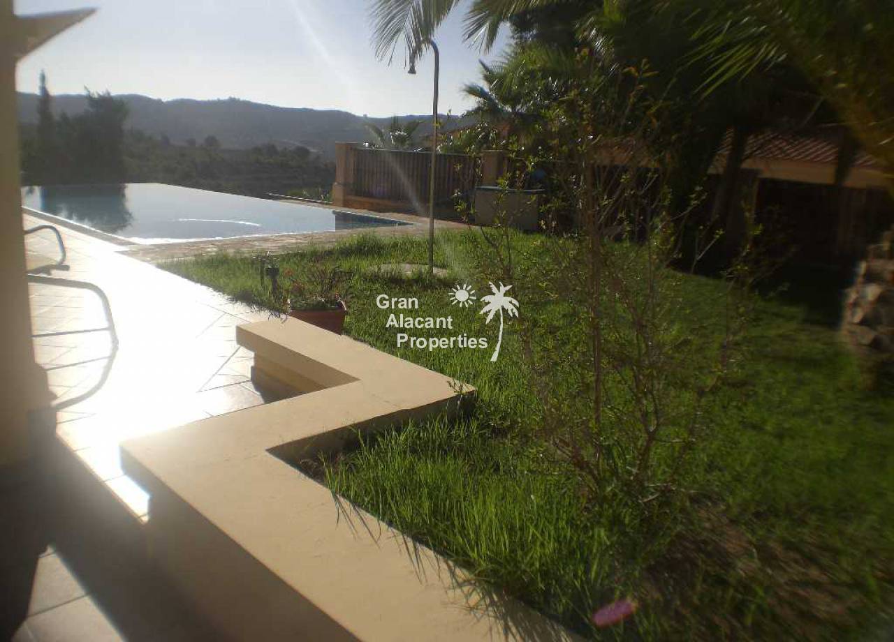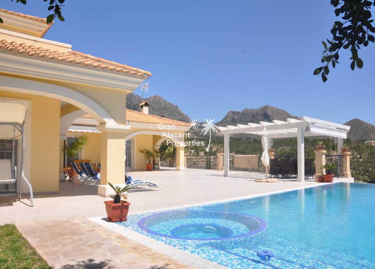 Large detached villa for sale in Busot on Spain's sunny Costa Blanca. This luxury home enjoys amazing views of the mountains, green spaces, the Med, Playa San Juan, El Campello and more.  The property offers 554 m2 of living space with over 200 m2 of exterior space in several terraces all with impressive views.