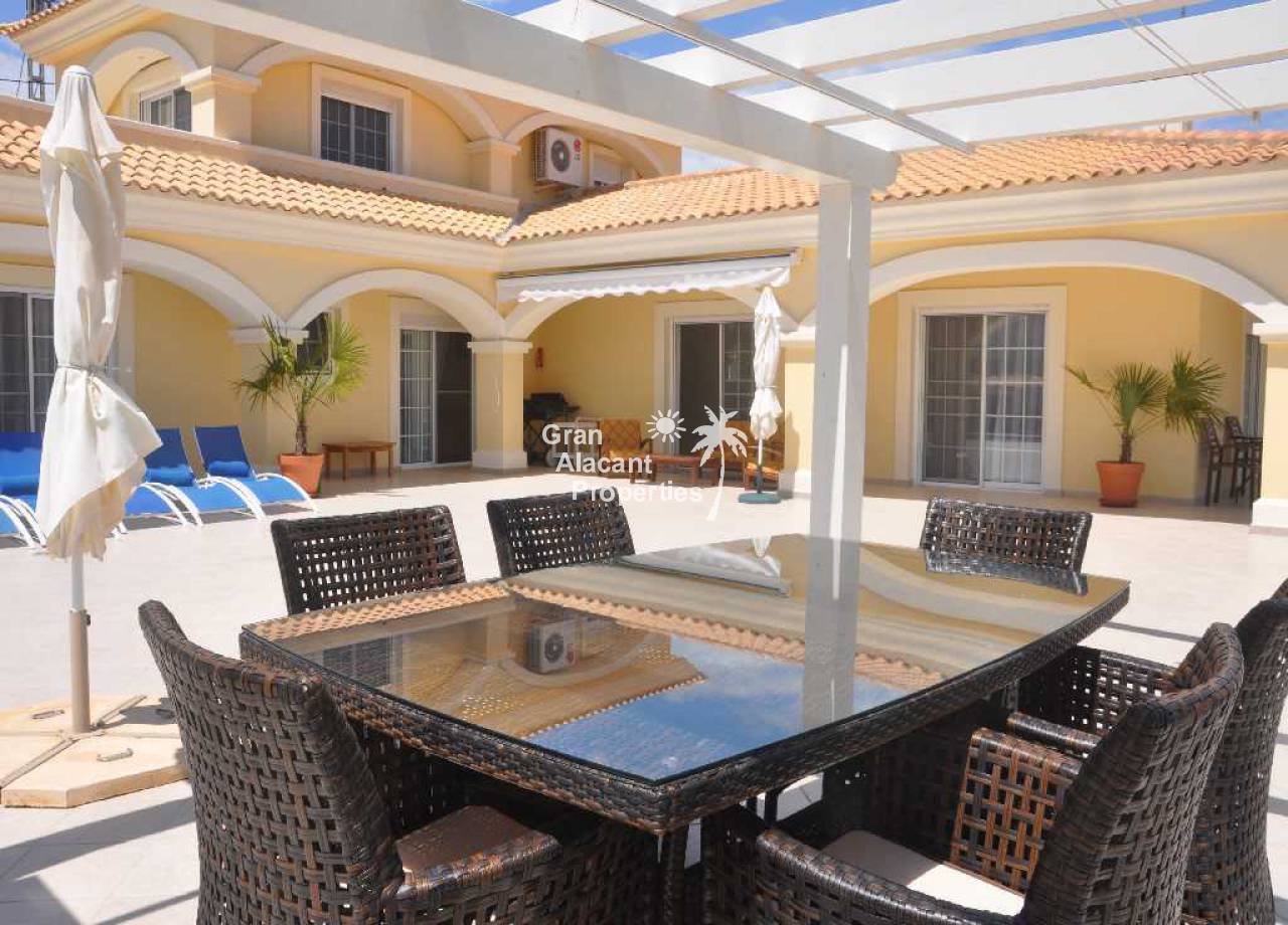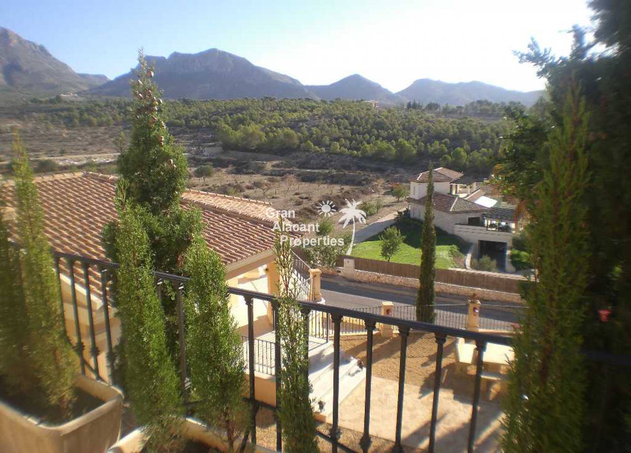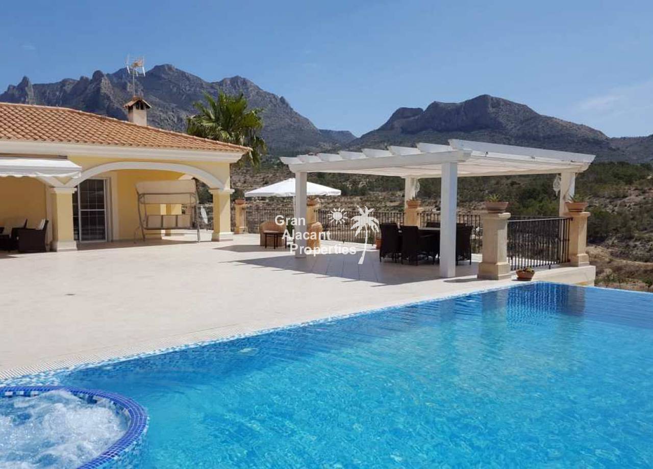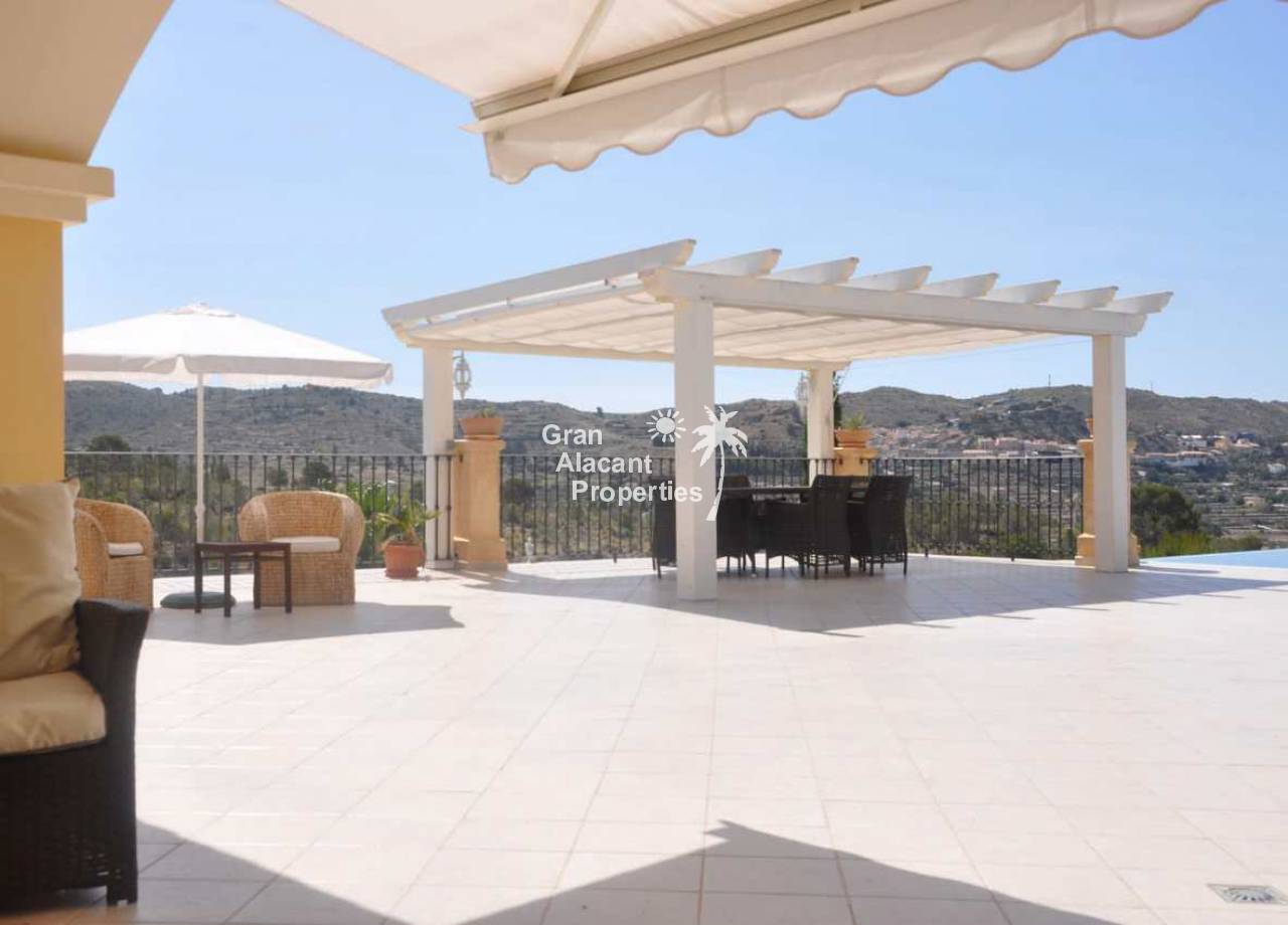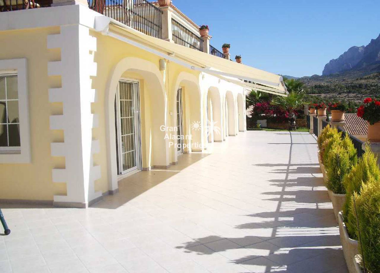 Large detached villa for sale in Busot on Spain's sunny Costa Blanca. This luxury home enjoys amazing views of the mountains, green spaces, the Med, Playa San Juan, El Campello and more.  The property offers 554 m2 of living space with over 200 m2 of exterior space in several terraces all with impressive views.