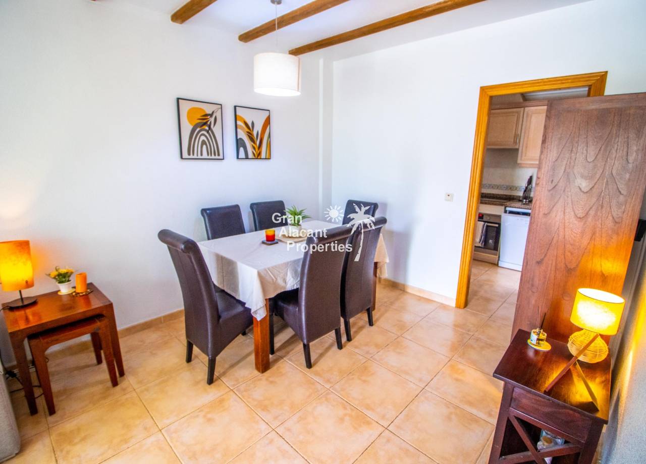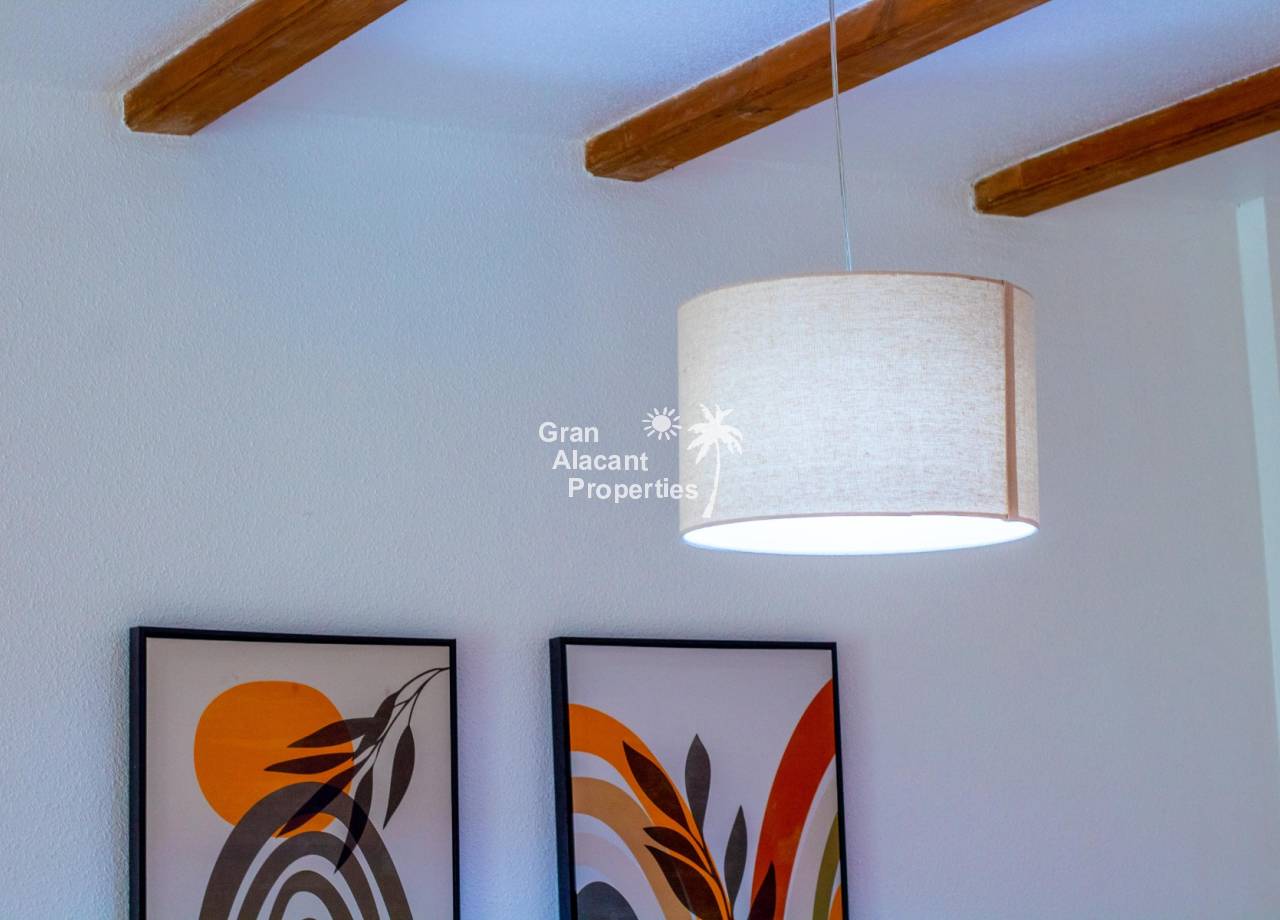 The Calpe-style apartment offers a bright and welcoming living and dining room with attractive wood beam details that add warmth and character to the space. Natural light fills the room, creating a relaxed and comfortable place to unwind after a day out exploring the coast or the nearby nature reserve.