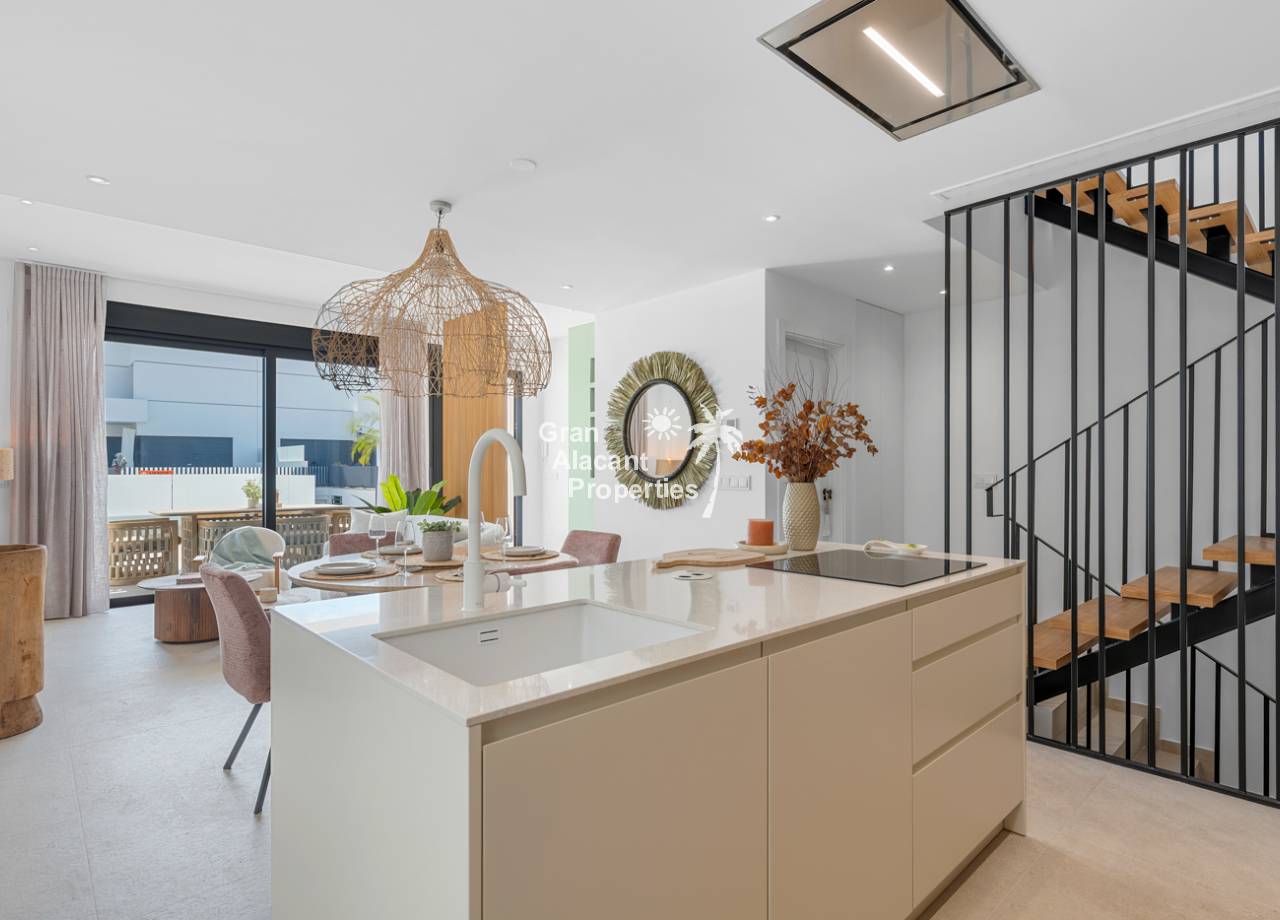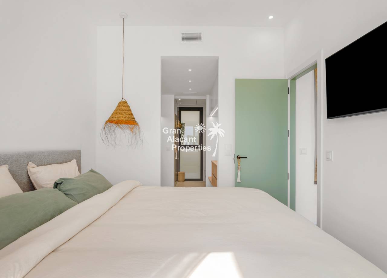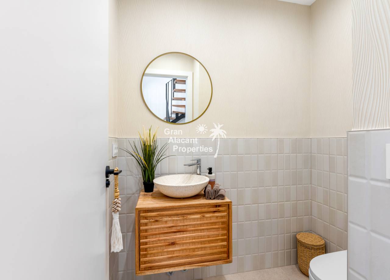 The interior of the townhouses is designed with comfort and modernity in mind. Featuring a layout that includes 3 bedrooms and 2 bathrooms, each space is optimized to offer functionality and style. The porcelain tile floors provide an elegant and durable finish. Electric shutters and air conditioning ensure a comfortable environment year-round. The kitchen is equipped with modern appliances, and the built-in wardrobes in the bedrooms provide efficient storage.