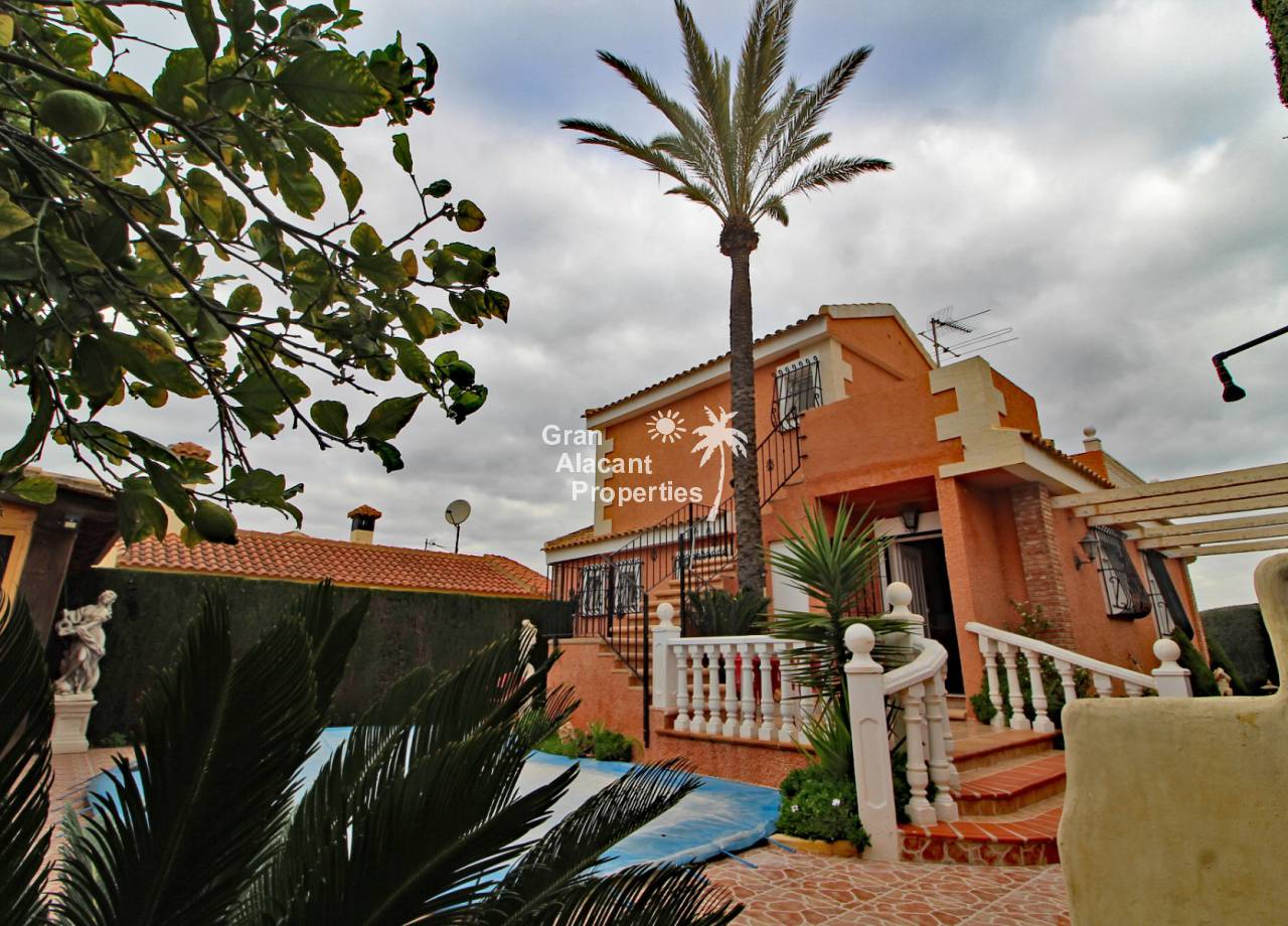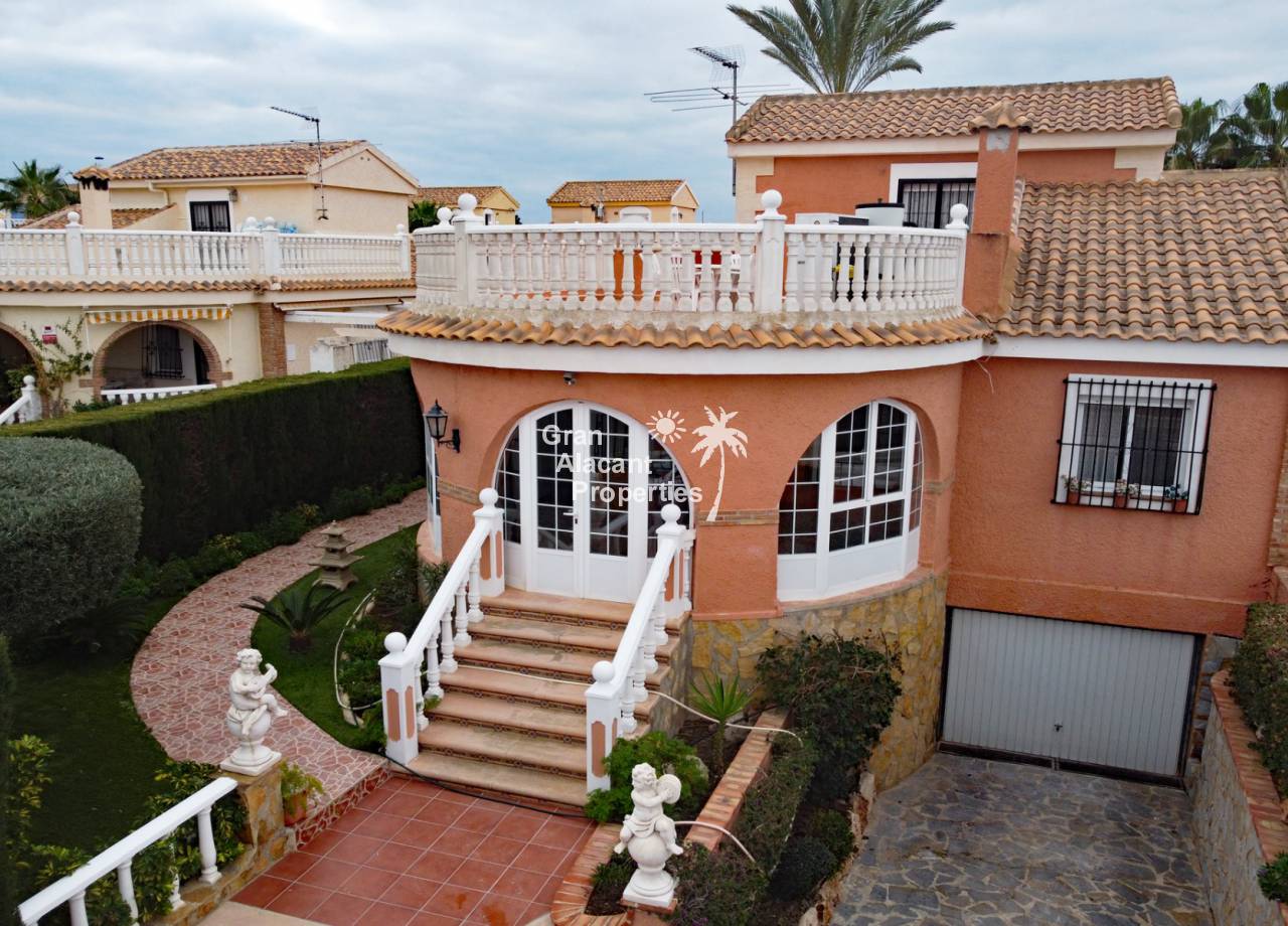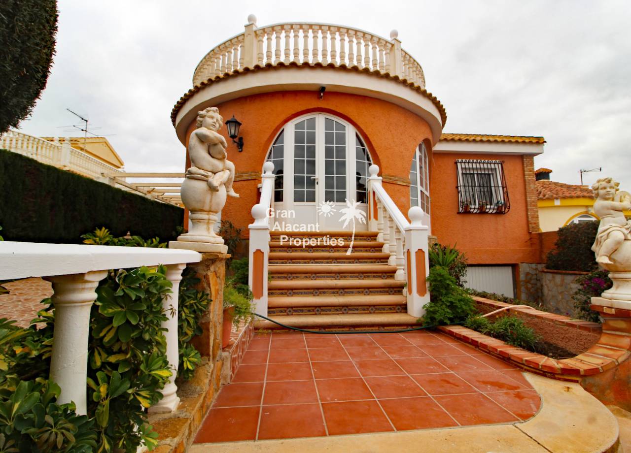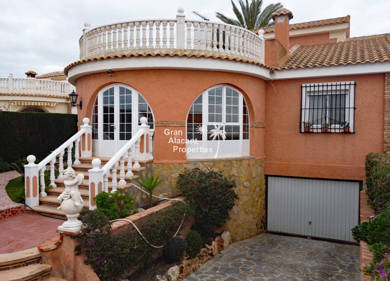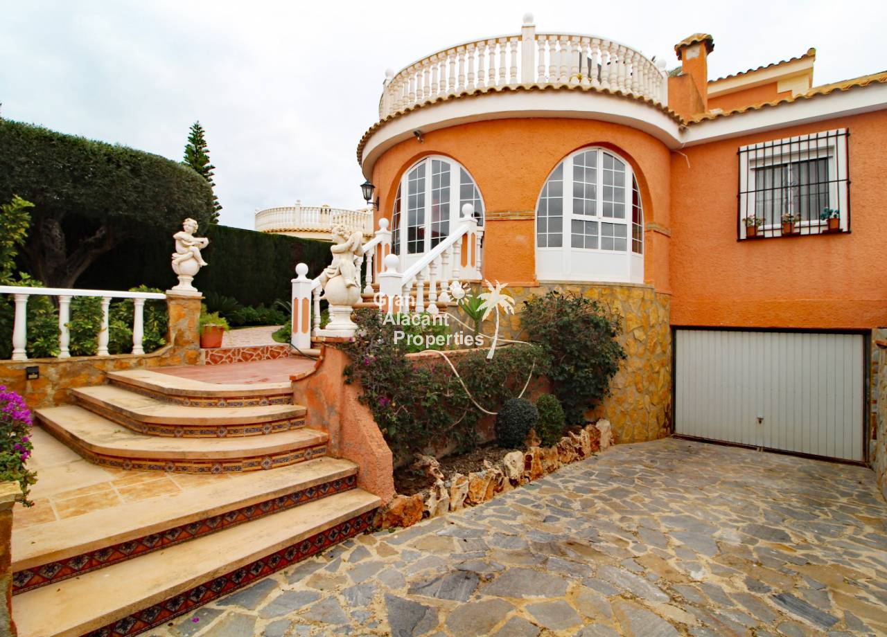 Located in the sought after Monte y Mar bajo neighbourhood of Gran Alacant on Spain's sunny Costa Blanca, close to the Plaza Mayor with its international supermarket, bars and restaurants, this gorgeous detached "Bellavista" style villa comes with sea views, a private swimming pool, summer kitchen and a garage / workshop and is ready to move into and live the dream.