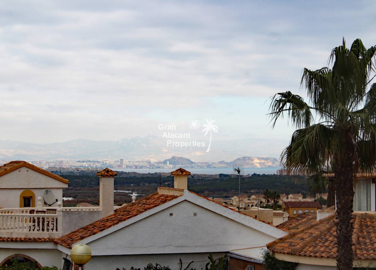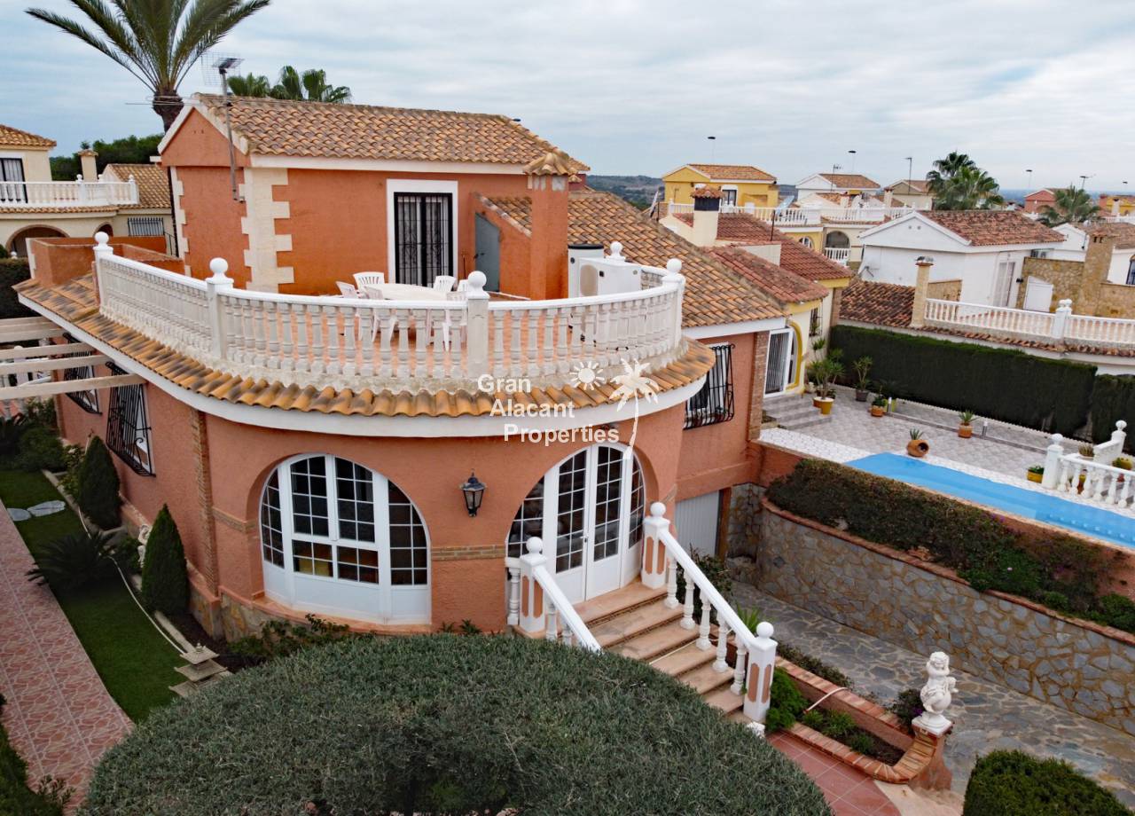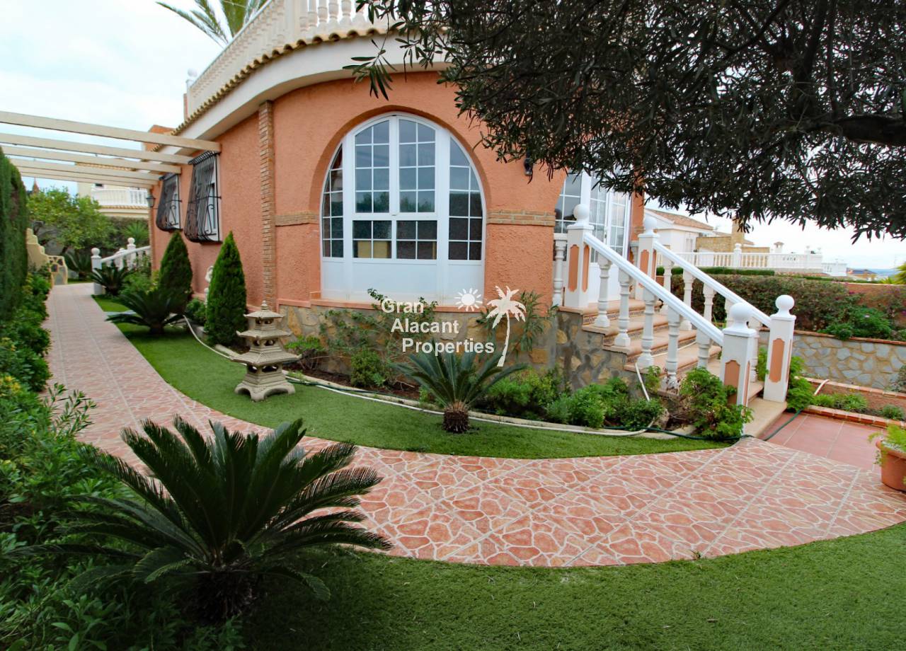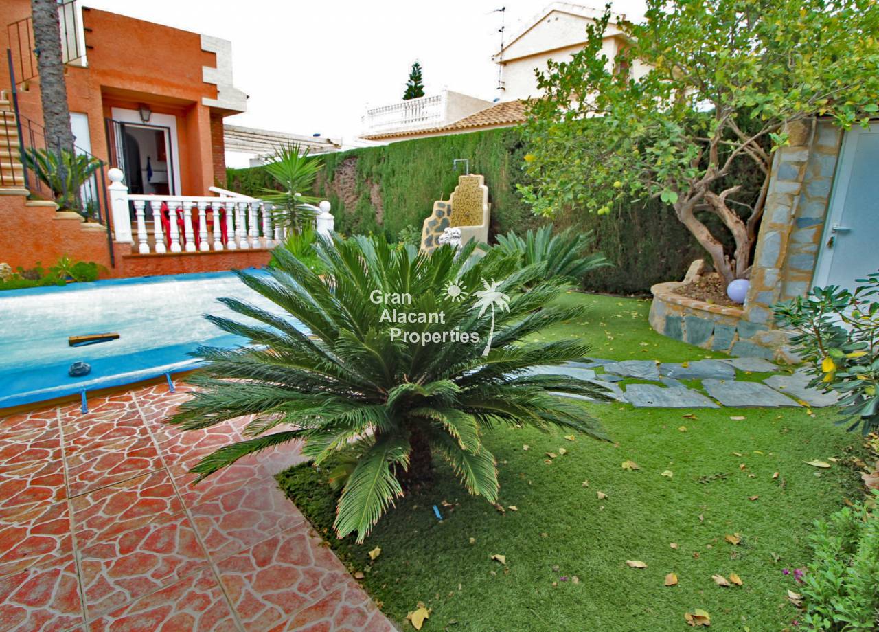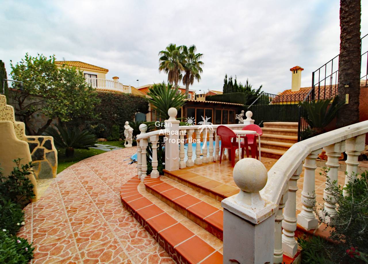 Located in the sought after Monte y Mar bajo neighbourhood of Gran Alacant on Spain's sunny Costa Blanca, close to the Plaza Mayor with its international supermarket, bars and restaurants, this gorgeous detached "Bellavista" style villa comes with sea views, a private swimming pool, summer kitchen and a garage / workshop and is ready to move into and live the dream.