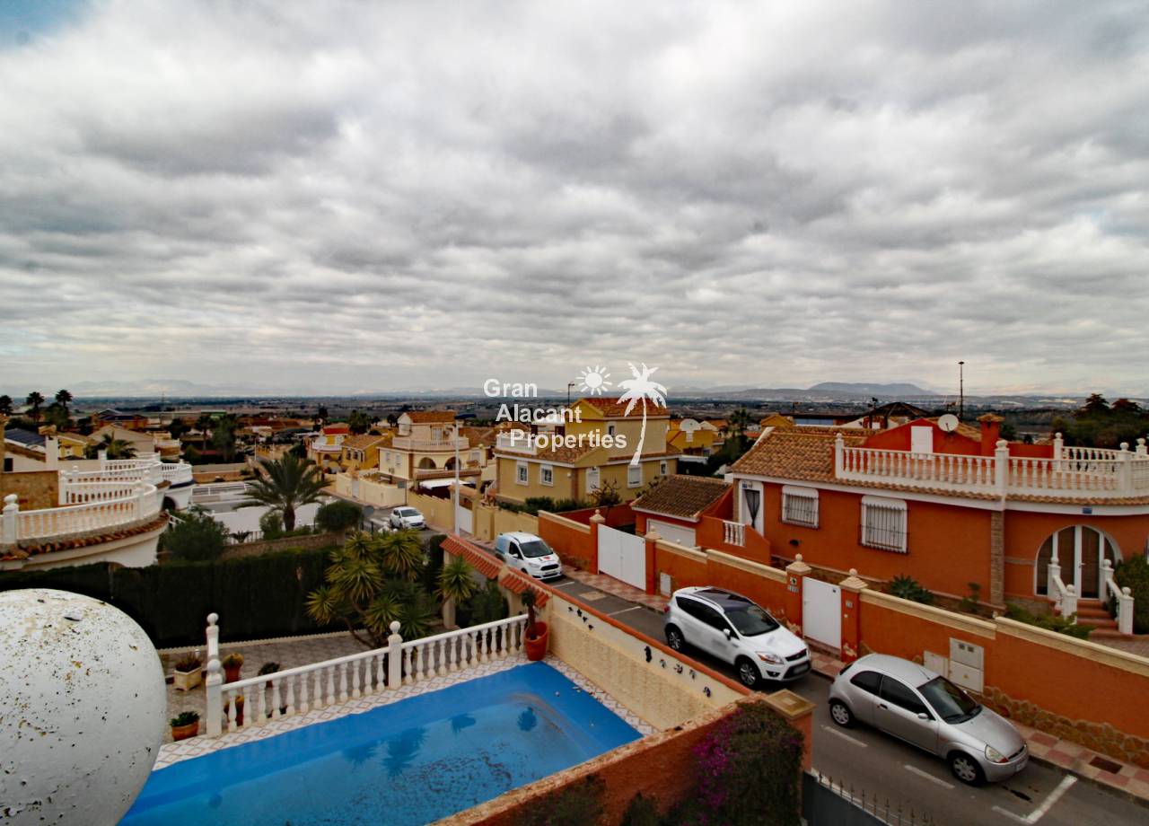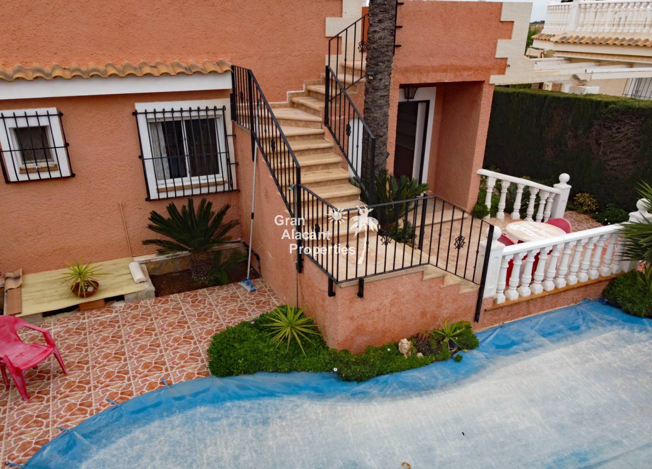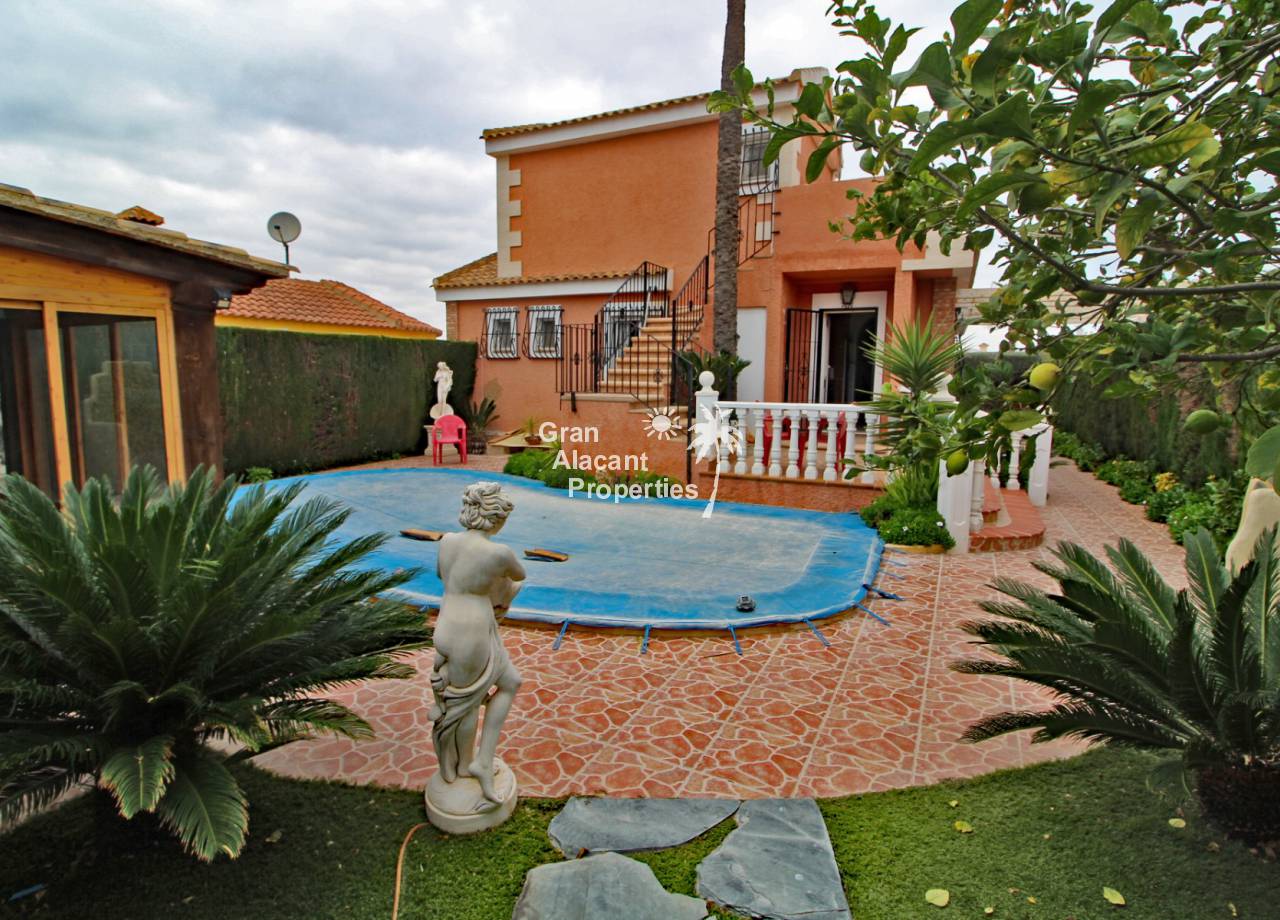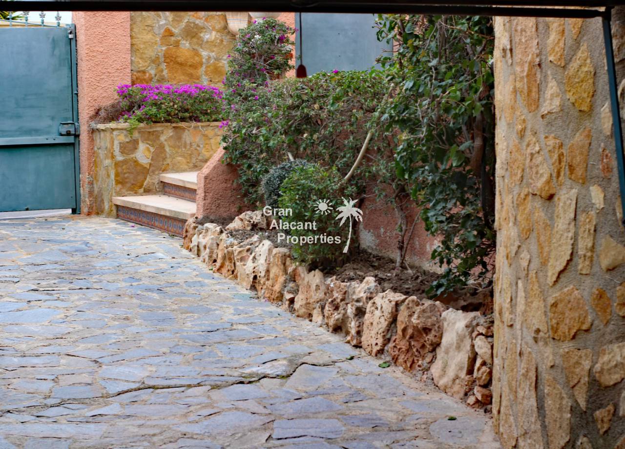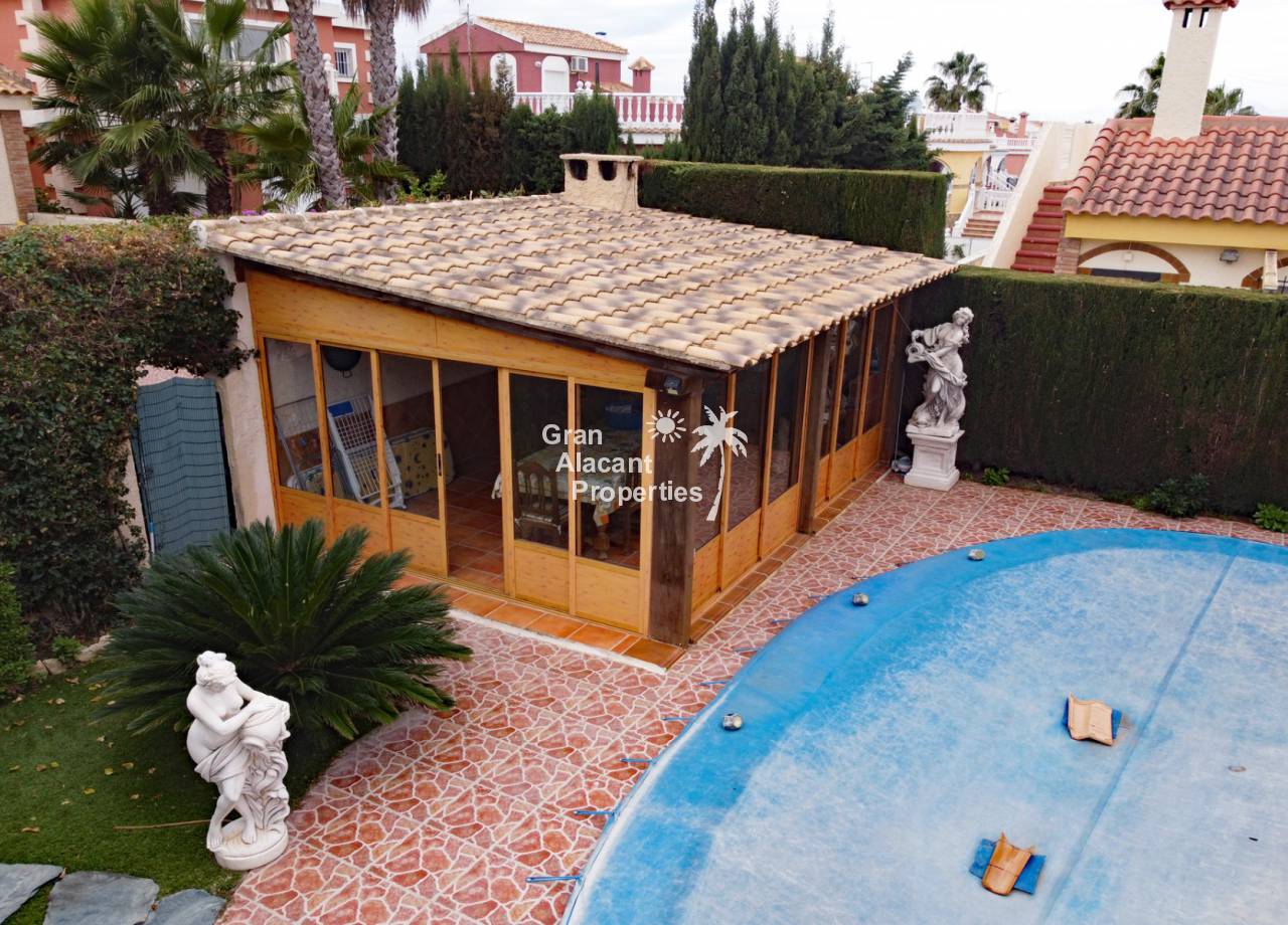 Located in the sought after Monte y Mar bajo neighbourhood of Gran Alacant on Spain's sunny Costa Blanca, close to the Plaza Mayor with its international supermarket, bars and restaurants, this gorgeous detached "Bellavista" style villa comes with sea views, a private swimming pool, summer kitchen and a garage / workshop and is ready to move into and live the dream.