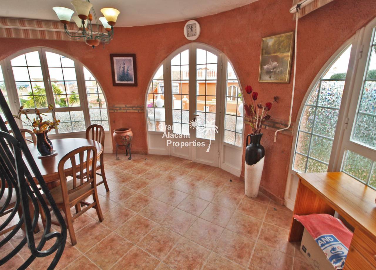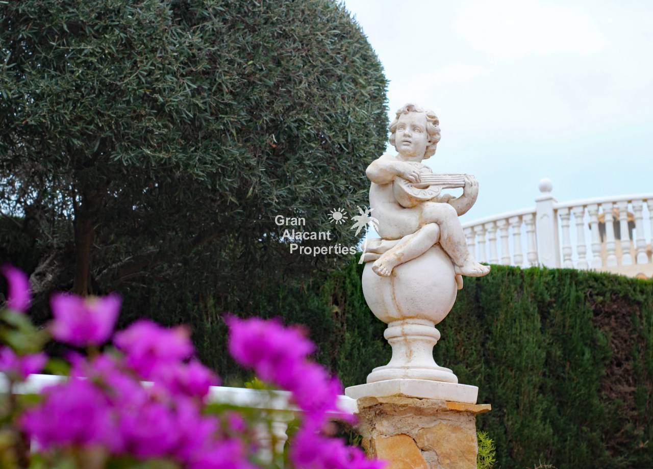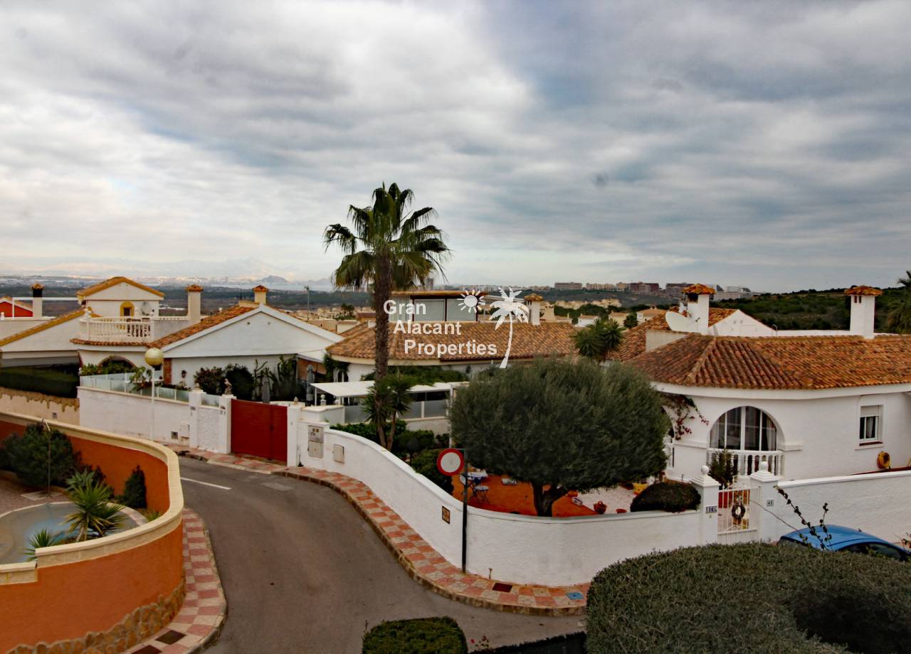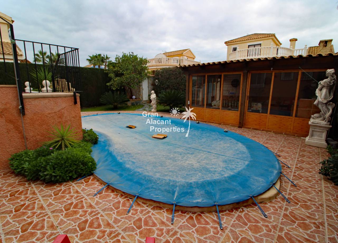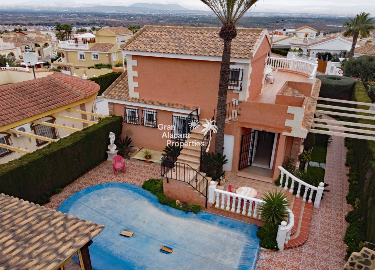 Located in the sought after Monte y Mar bajo neighbourhood of Gran Alacant on Spain's sunny Costa Blanca, close to the Plaza Mayor with its international supermarket, bars and restaurants, this gorgeous detached "Bellavista" style villa comes with sea views, a private swimming pool, summer kitchen and a garage / workshop and is ready to move into and live the dream.