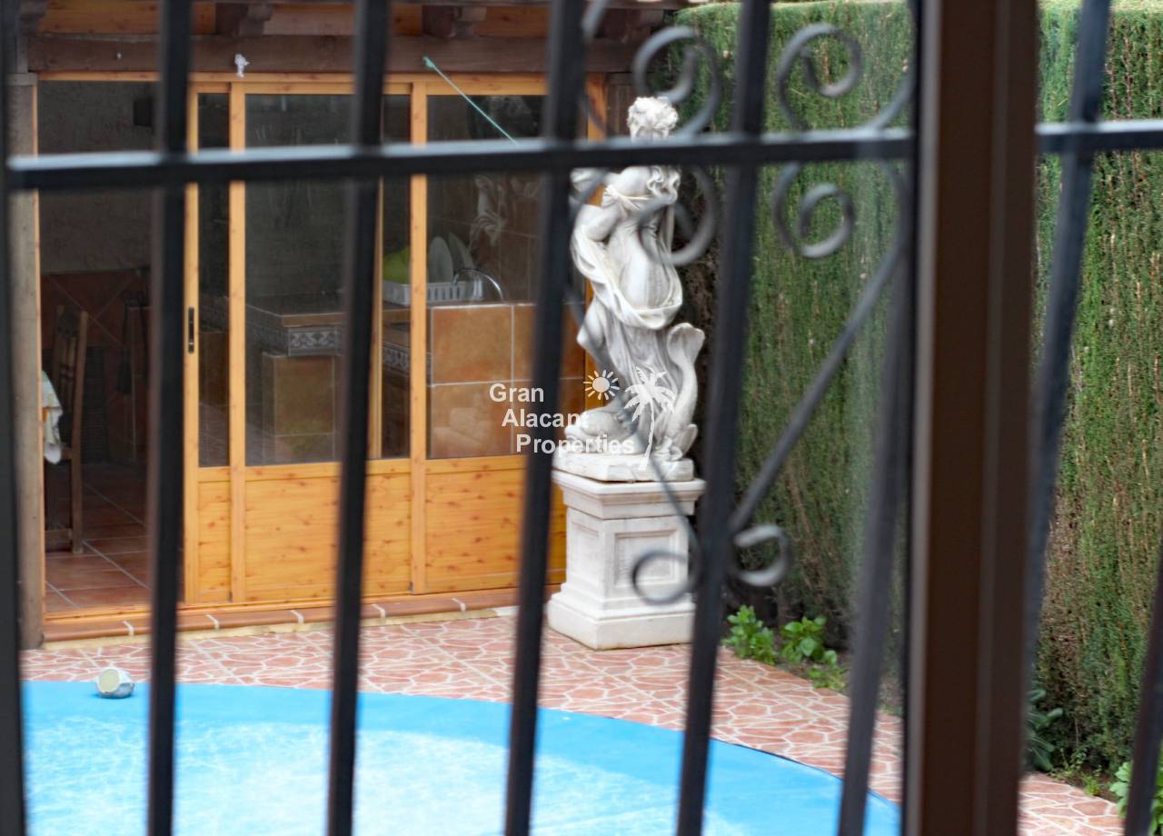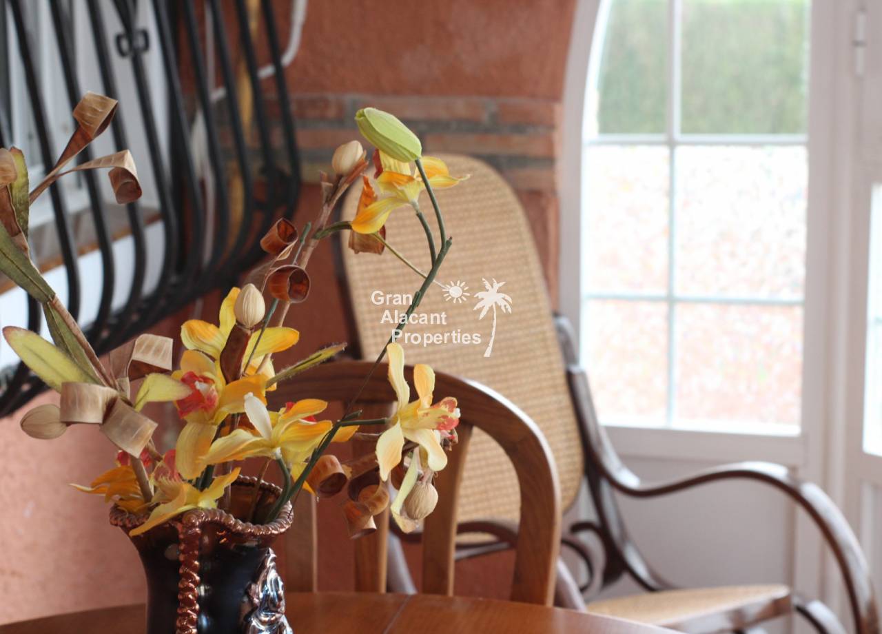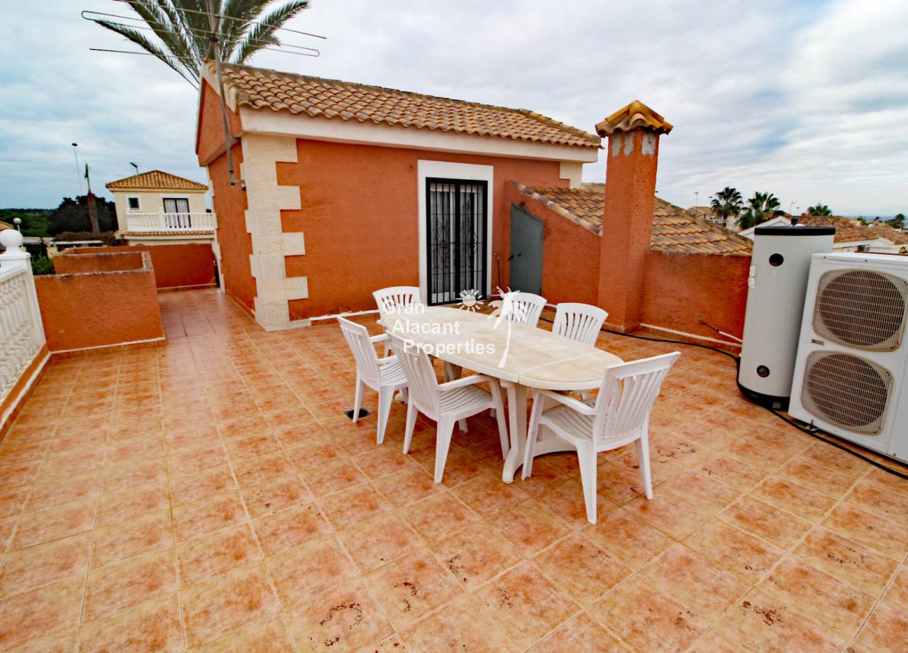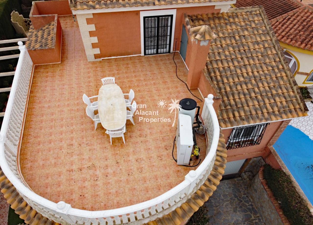 Outside, the well established picturesque garden (400 m²) with various fruit trees, including lemons and olives for those cocktails... artificial grass (low maintenance), the garden offers plenty of space for entertaining or enjoying the year round Spanish sunshine. Best of all is the private swimming pool perfect for cooling off on those hot summer days.  There is also a summer kitchen / bbq / dining area to offer some respite from the mid day sun. This villa also has a unique feature, access to the solarium with panoramic views, this can be accessed via an external staircase and / or the first floor master bedroom, which means that guests do not need to go through the first floor master bedroom to see the views or enjoy the solarium.
