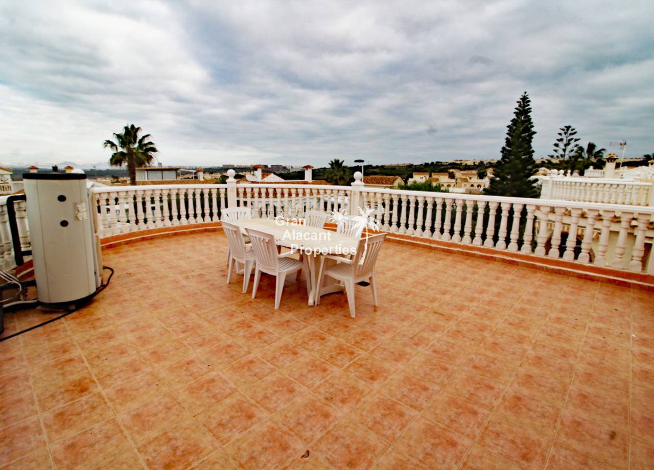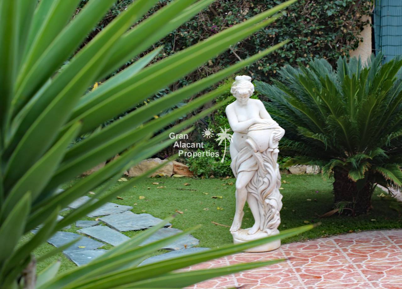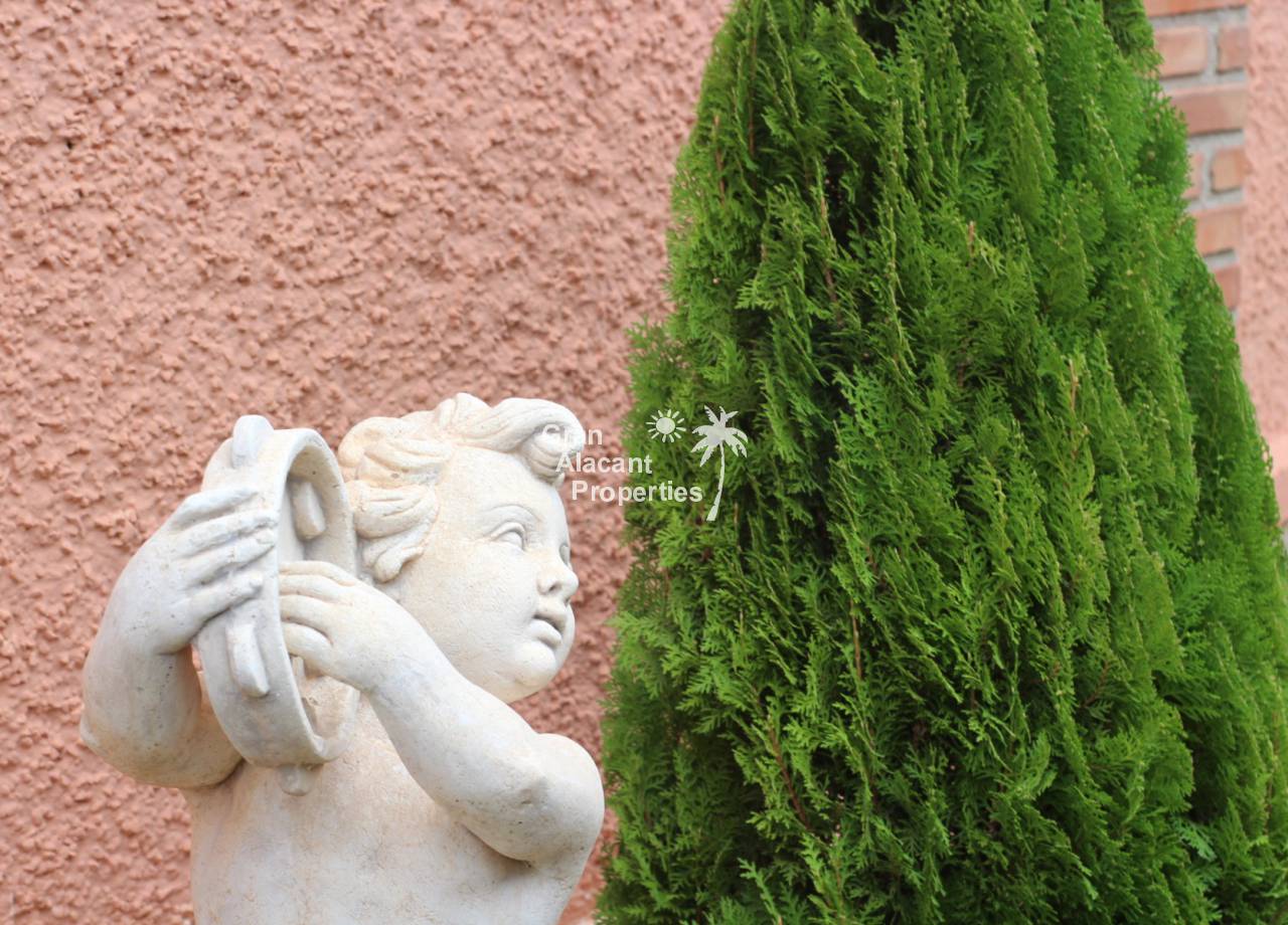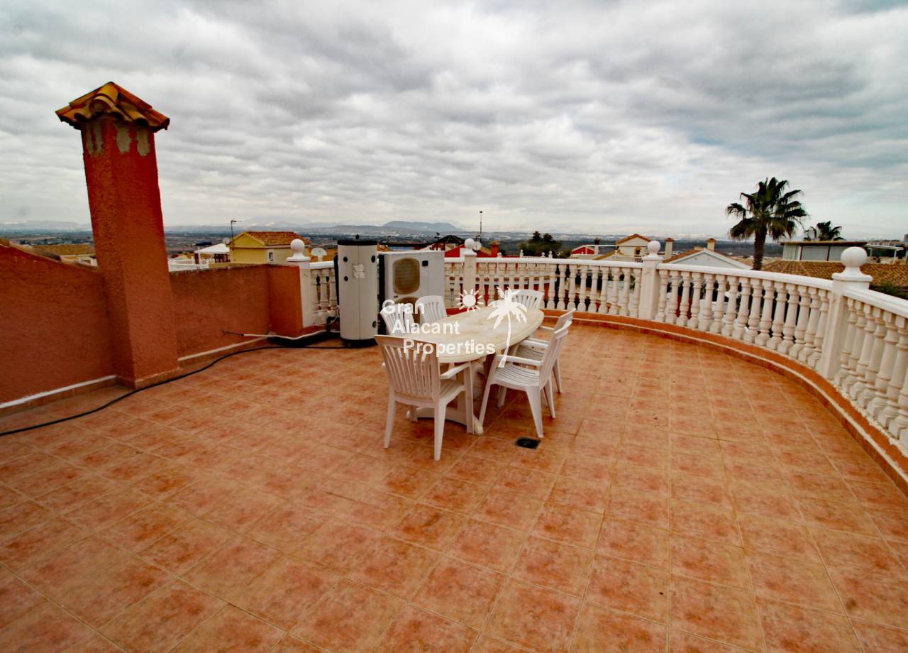 Outside, the well established picturesque garden (400 m²) with various fruit trees, including lemons and olives for those cocktails... artificial grass (low maintenance), the garden offers plenty of space for entertaining or enjoying the year round Spanish sunshine. Best of all is the private swimming pool perfect for cooling off on those hot summer days.  There is also a summer kitchen / bbq / dining area to offer some respite from the mid day sun. This villa also has a unique feature, access to the solarium with panoramic views, this can be accessed via an external staircase and / or the first floor master bedroom, which means that guests do not need to go through the first floor master bedroom to see the views or enjoy the solarium.