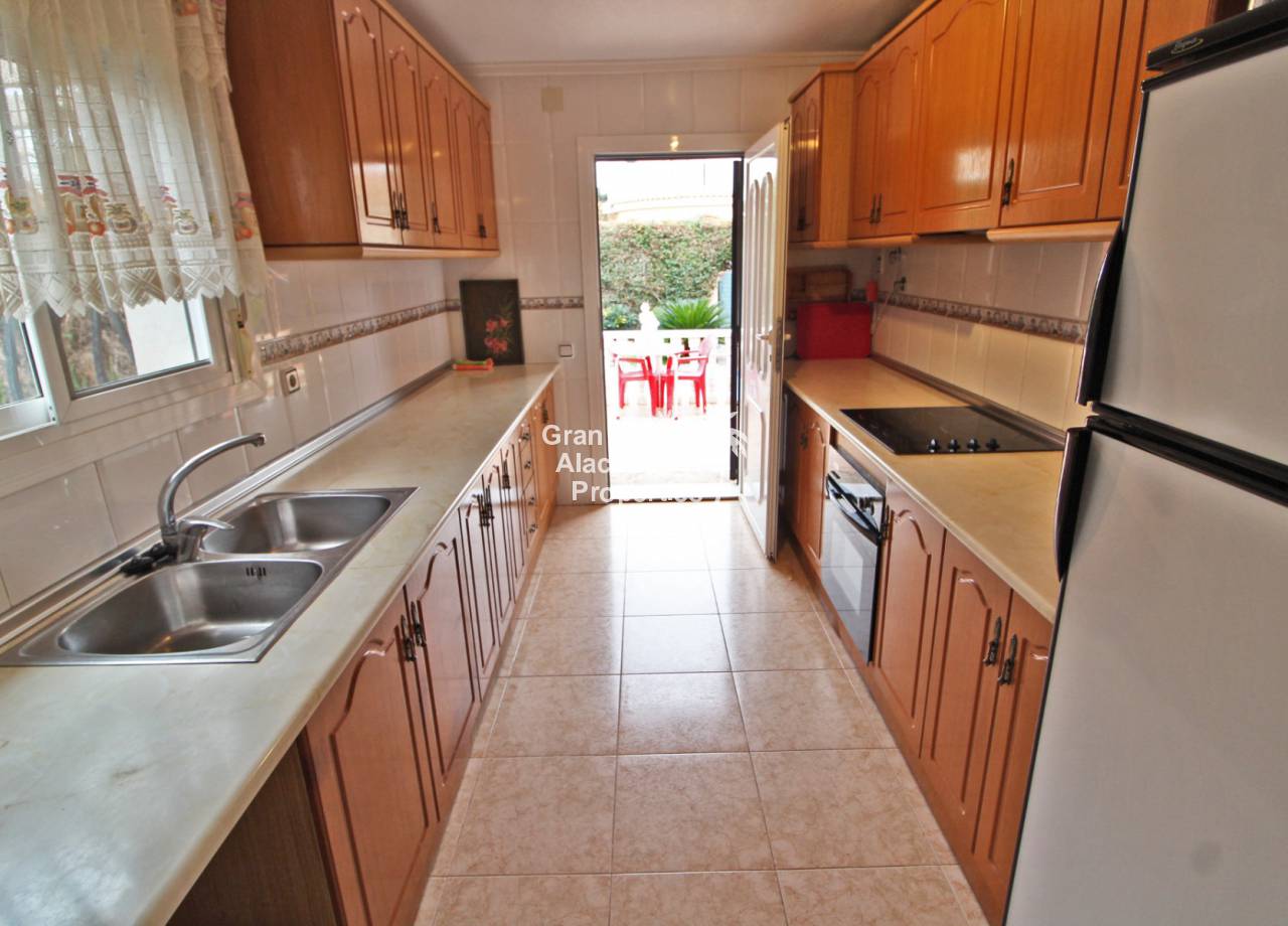 On the ground floor,  there is a glazed in terrace overlooking the garden that offers additional living space, it is currently being used as a breakfast room, an open plan living and dining room, a convenient galley style kitchen with direct access out to the back garden, the pool and summer kitchen, 2 double bedrooms with built in wardrobes, one of which is en-suite and a family bathroom. Upstairs, there is an en-suite bedroom with built-in wardrobes and direct access to a large sunny solarium with views down over the garden and pool as well as out accross the sea, countryside and mountains.