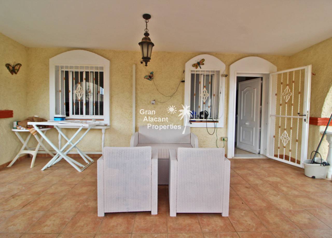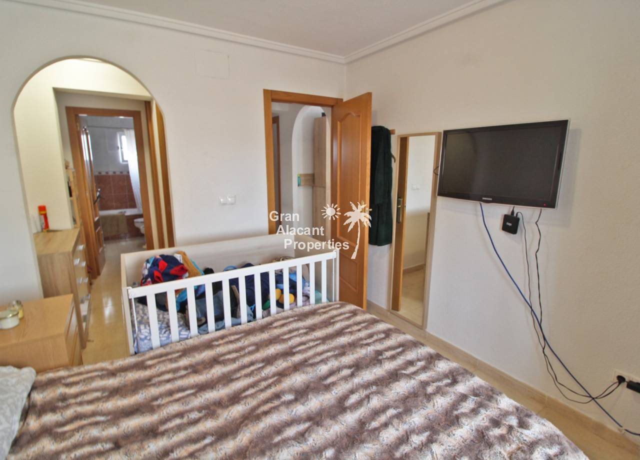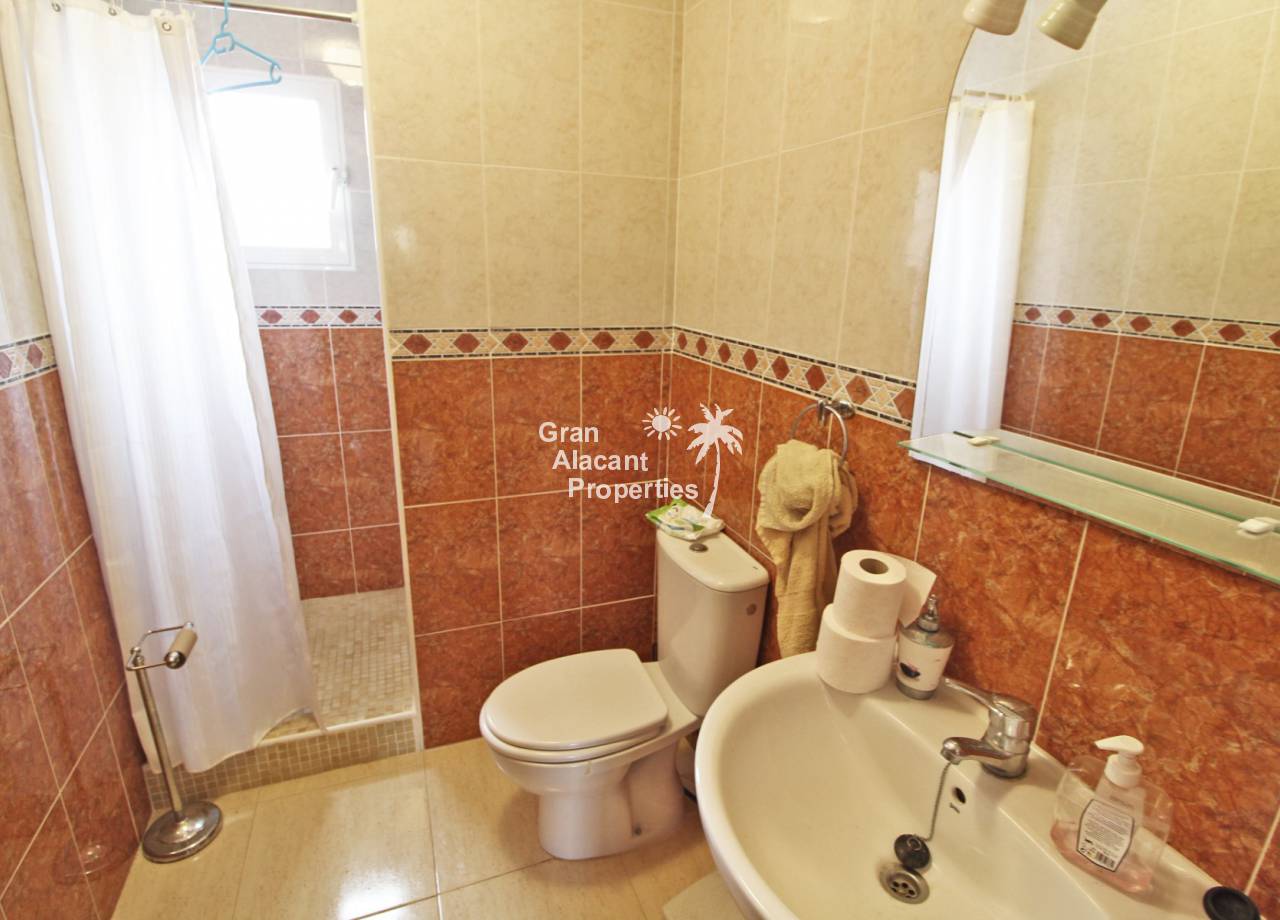 This 3 bedroom, 3 bathroom “Luna” style villa comes with a private pool is for sale on the up and coming urbanization of Montecid on Spain’s sunny Costa Blanca.  On the ground floor, you enter the house through a covered porch offering a shady seating area overlooking the garden and pool into a large air-conditioned living / dining room with fireplace, a convenient galley style kitchen with its own direct access to the garden, an air-conditioned en-suite master bedroom with built-in wardrobes, an additional air-conditioned double bedroom with built in wardrobe and completing the ground floor, a guest bathroom. Upstairs, there is another air-conditioned en-suite bedroom with built-in wardrobes and access to a large solarium with countryside and mountain views.