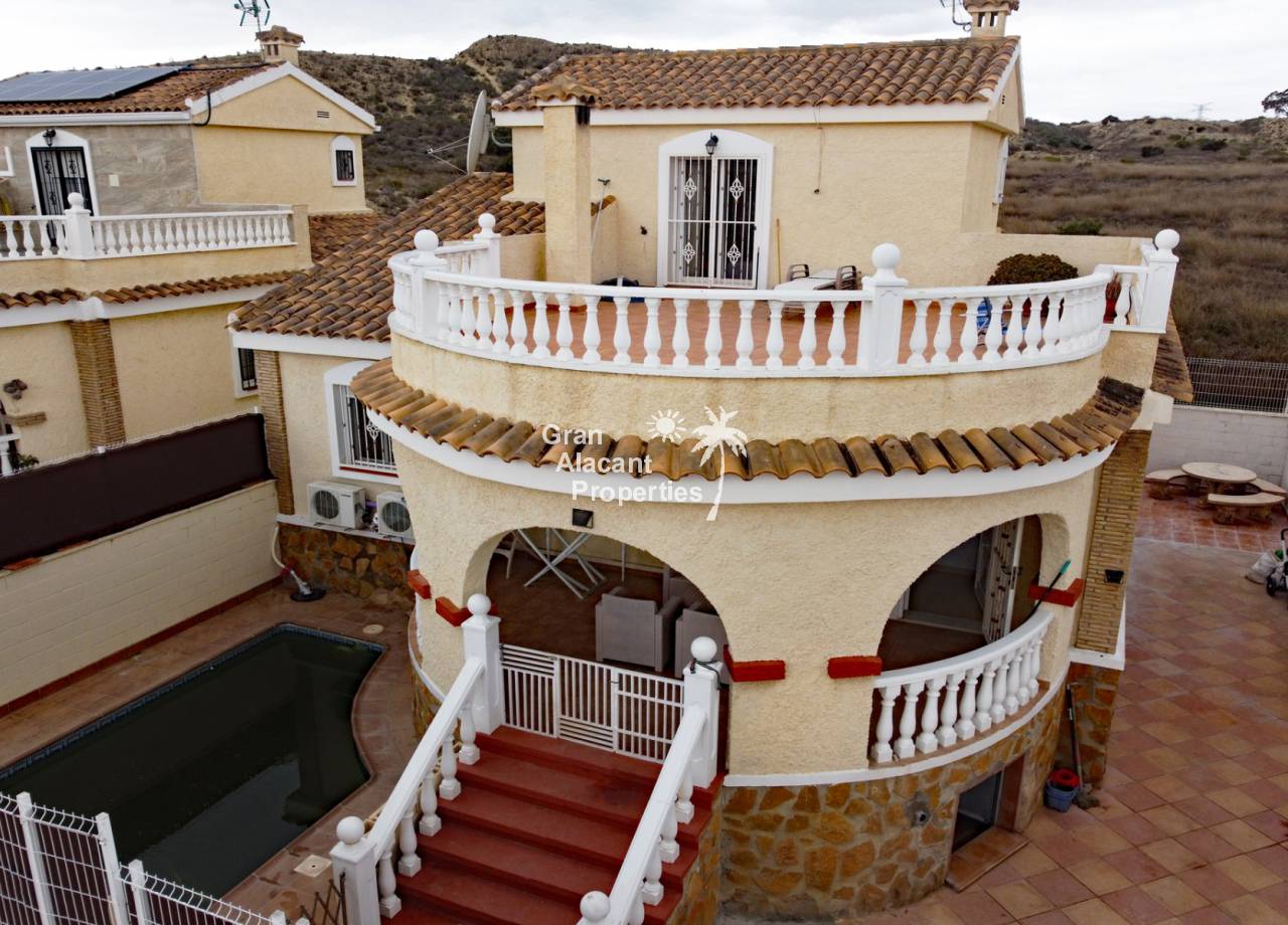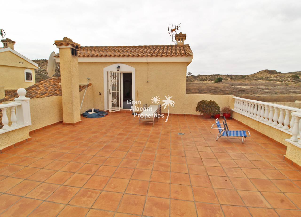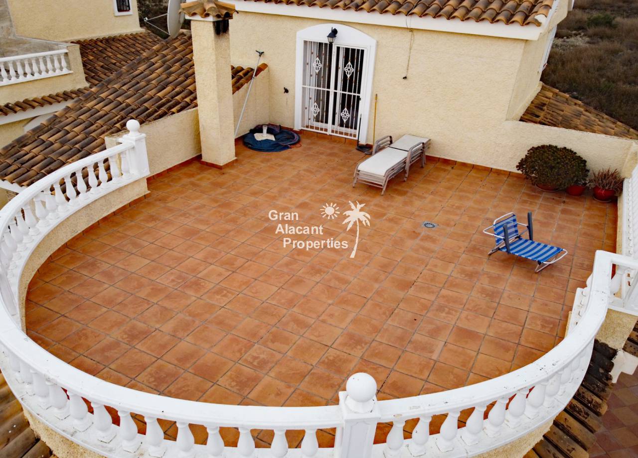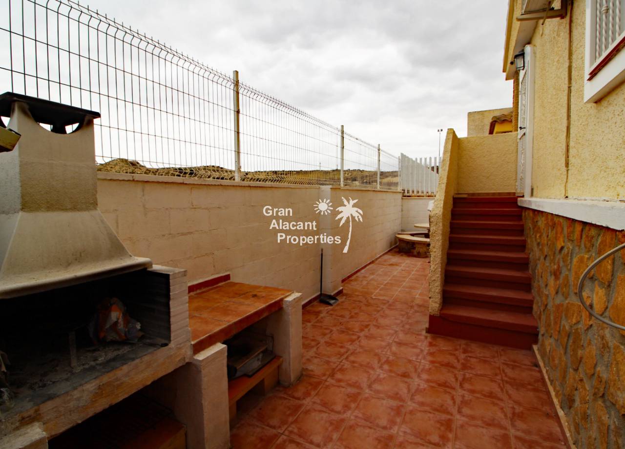 This 3 bedroom, 3 bathroom “Luna” style villa comes with a private pool is for sale on the up and coming urbanization of Montecid on Spain’s sunny Costa Blanca.  On the ground floor, you enter the house through a covered porch offering a shady seating area overlooking the garden and pool into a large air-conditioned living / dining room with fireplace, a convenient galley style kitchen with its own direct access to the garden, an air-conditioned en-suite master bedroom with built-in wardrobes, an additional air-conditioned double bedroom with built in wardrobe and completing the ground floor, a guest bathroom. Upstairs, there is another air-conditioned en-suite bedroom with built-in wardrobes and access to a large solarium with countryside and mountain views.