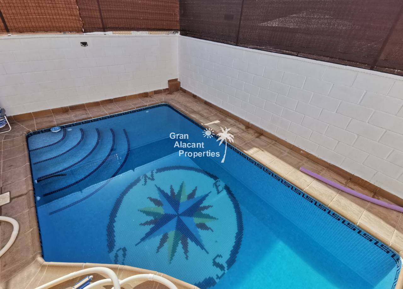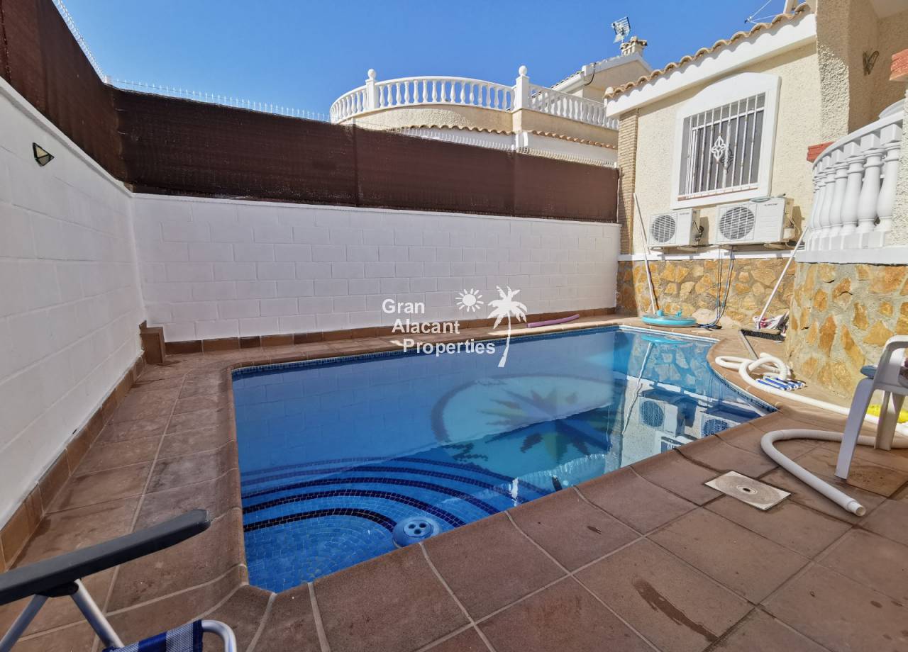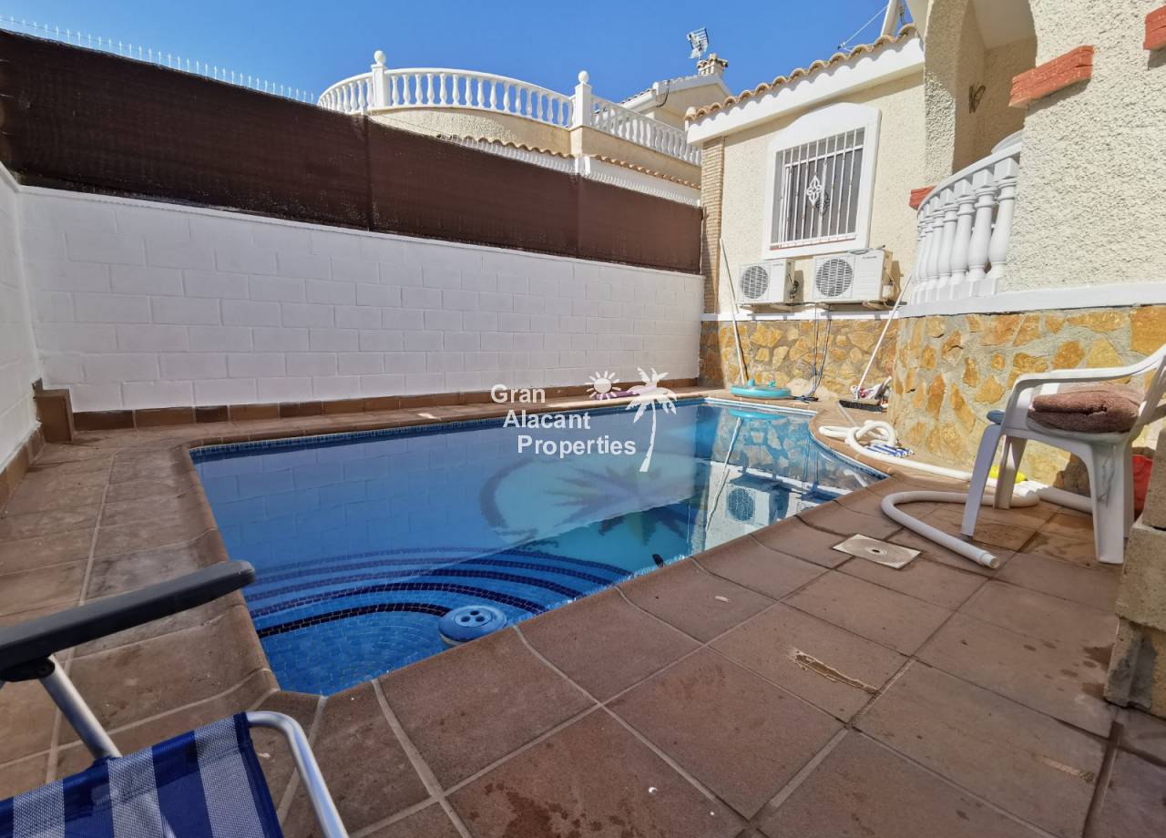 This 3 bedroom, 3 bathroom “Luna” style villa comes with a private pool for sale on the up-and-coming urbanization of Montecid on Spain’s sunny Costa Blanca. On the ground floor, you enter the house through a covered porch offering a shady seating area overlooking the garden and pool into a large air-conditioned living/dining room with fireplace, a convenient galley style kitchen with its own direct access to the garden, an air-conditioned en-suite master bedroom with built-in wardrobes, an additional air-conditioned double bedroom with built-in wardrobe and completing the ground floor, a guest bathroom. Upstairs, there is another air-conditioned en-suite bedroom with built-in wardrobes and access to a large solarium with countryside and mountain views.