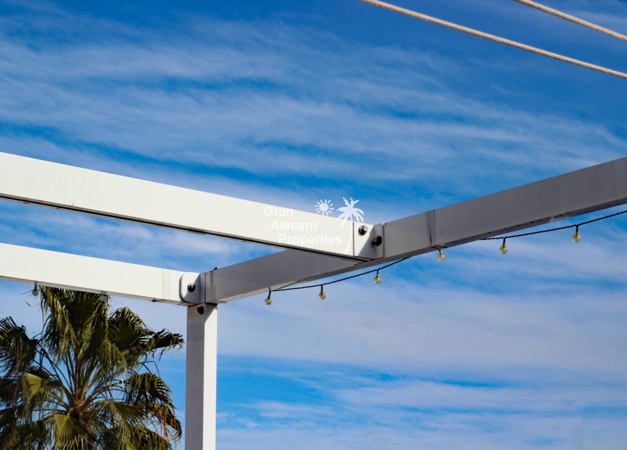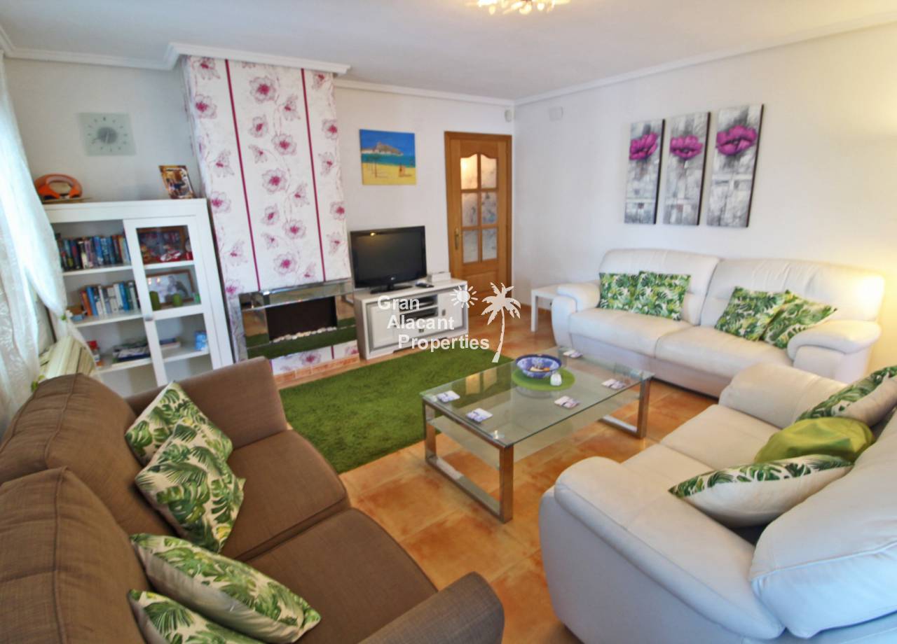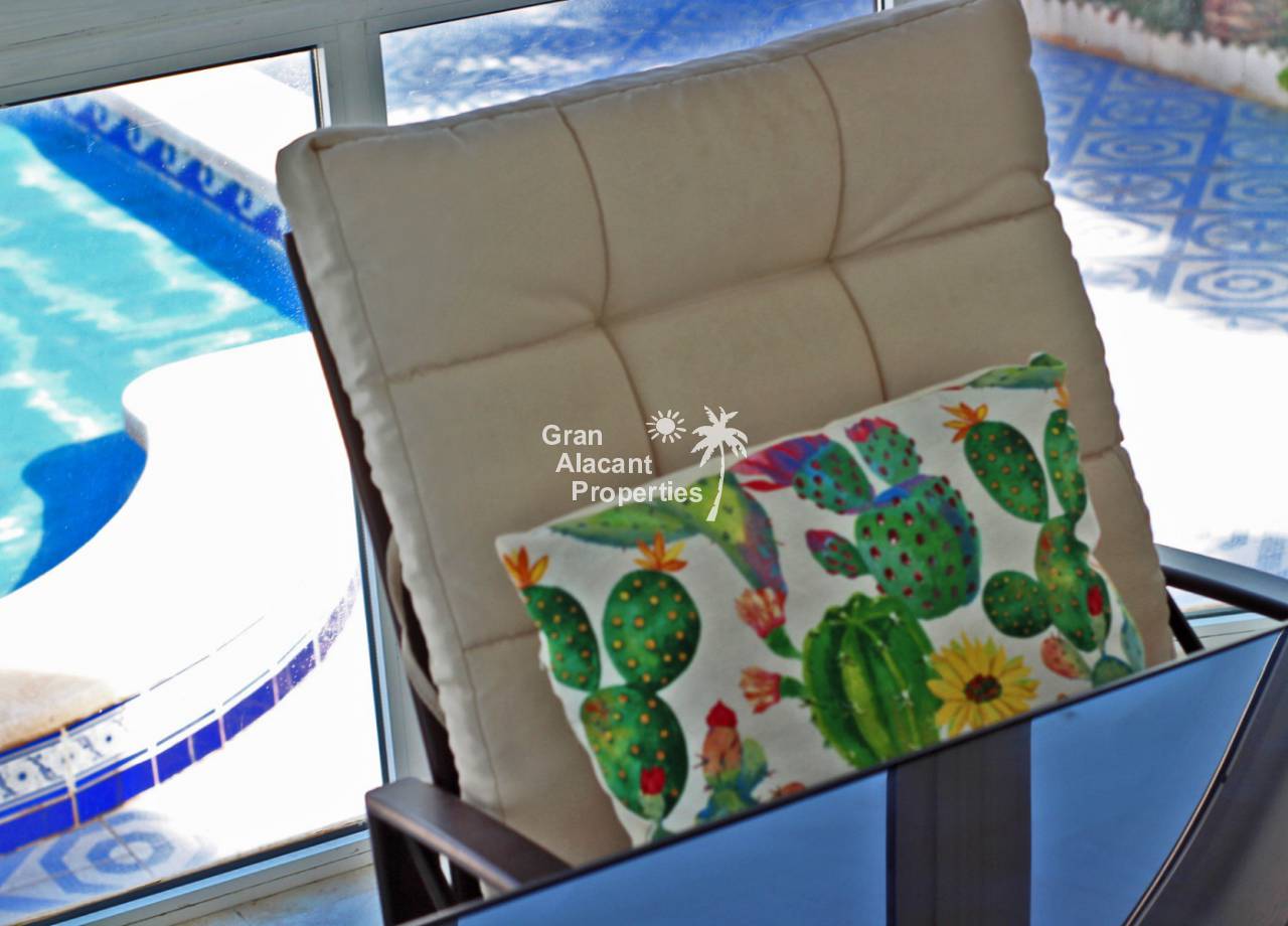 Outside, the low-maintenance garden (375 m²) offers plenty of space for entertaining or enjoying the Spanish sunshine. Upstairs, there is a solarium with panoramic views over the countryside, mountains, Alicante, the castle, and the sea. The private heated swimming pool is perfect for cooling off on hot summer days, also being heated means that the swimming season is longer than normal, which is a bonus...