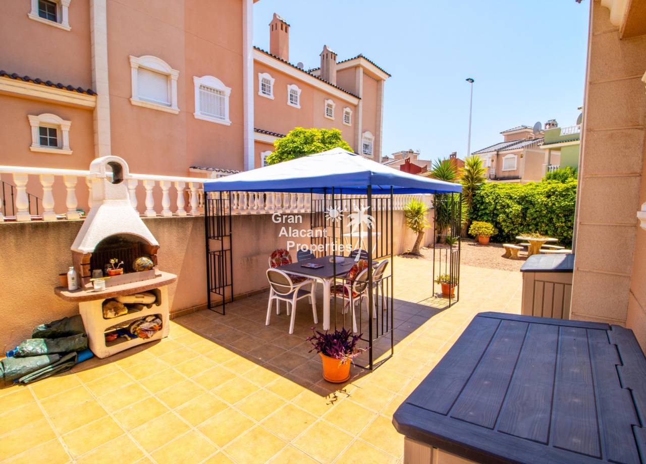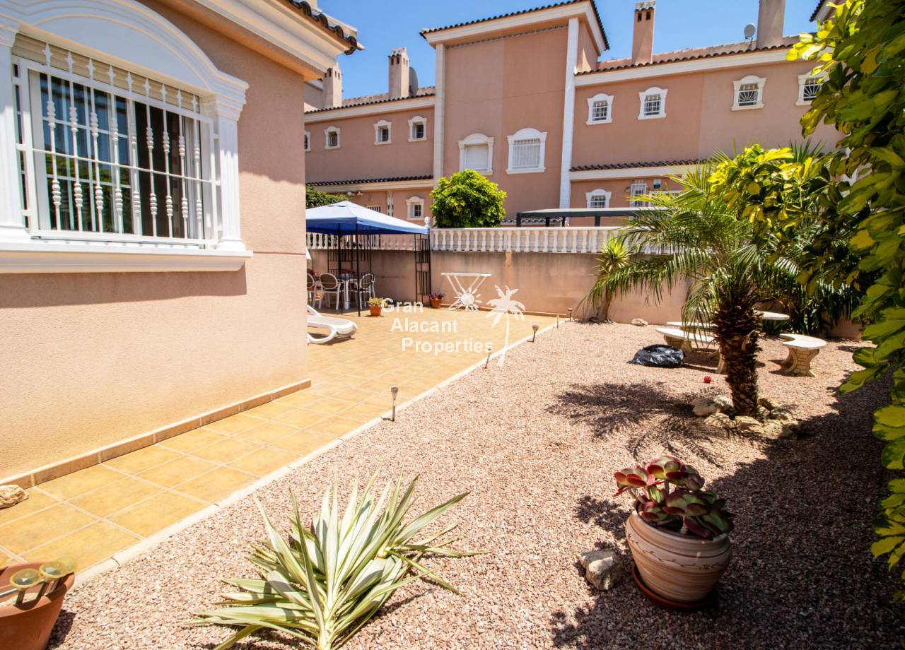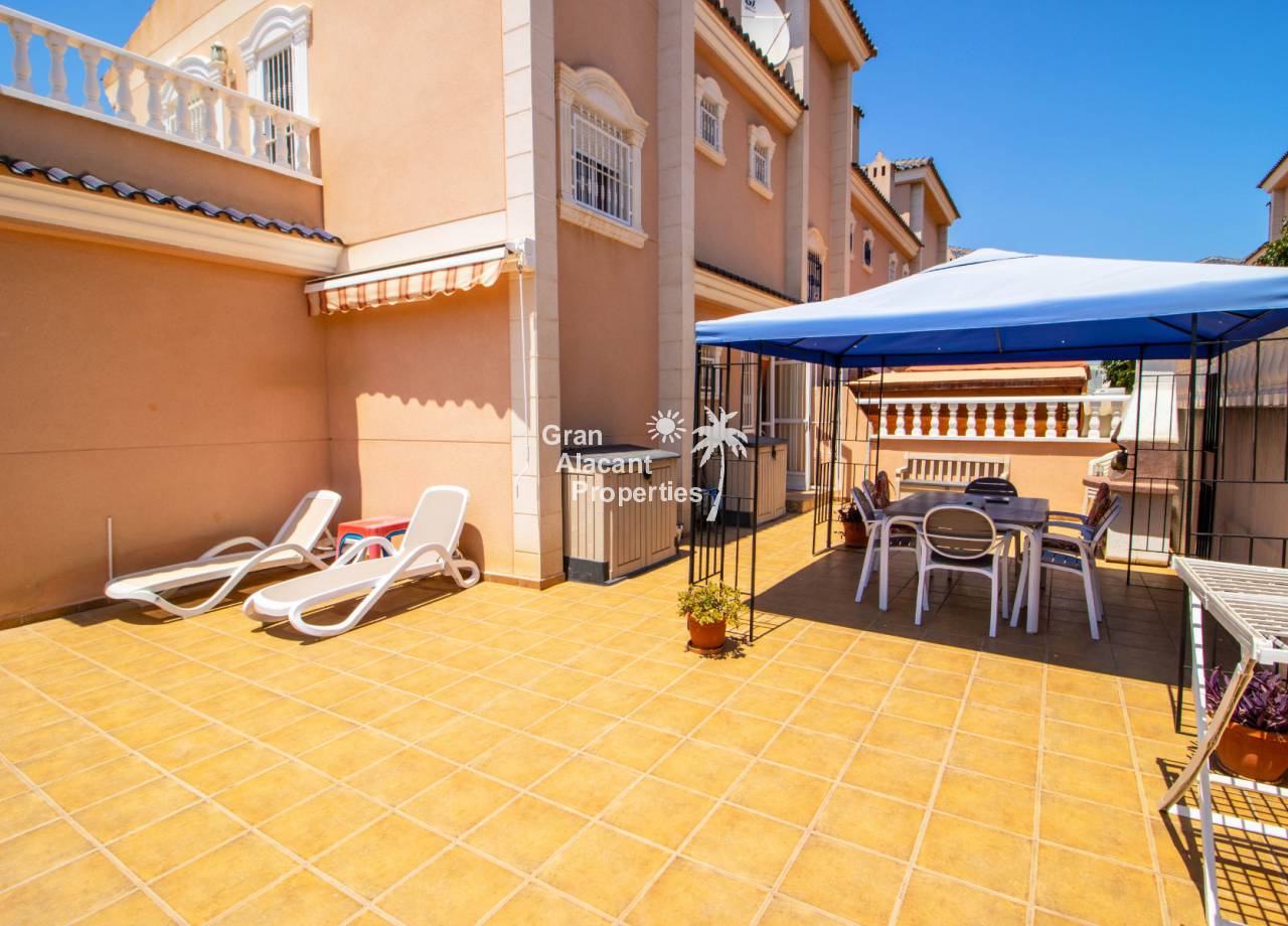 Well presented south-west facing semi-detached house located on the sought after community of Puerto Marino in Gran Alacant on Spain’s sunny Costa Blanca. This house features 3 x double bedrooms (1 bedroom on the ground floor currently used as a dining room) 1 x en-suite and 2 family bathrooms, a combined living and dining room, a large low maintenance garden (front, side & rear of the house) with space for a private pool should the new owner decide to install one, a BBQ, a covered front porch, a balcony on the master bedroom, a second balcony and an independant kitchen with utility area. There is double glazing throughout, toldos, air-conditioning hot & cold (x 3 machines), security bars, ceiling fans and window screens The house is built to a good standard and comes with many nice features. There is also access to 2 communal swimming pools and a childrens play area. The house is sold furnished and equipped, so ready to move into and start living the dream.